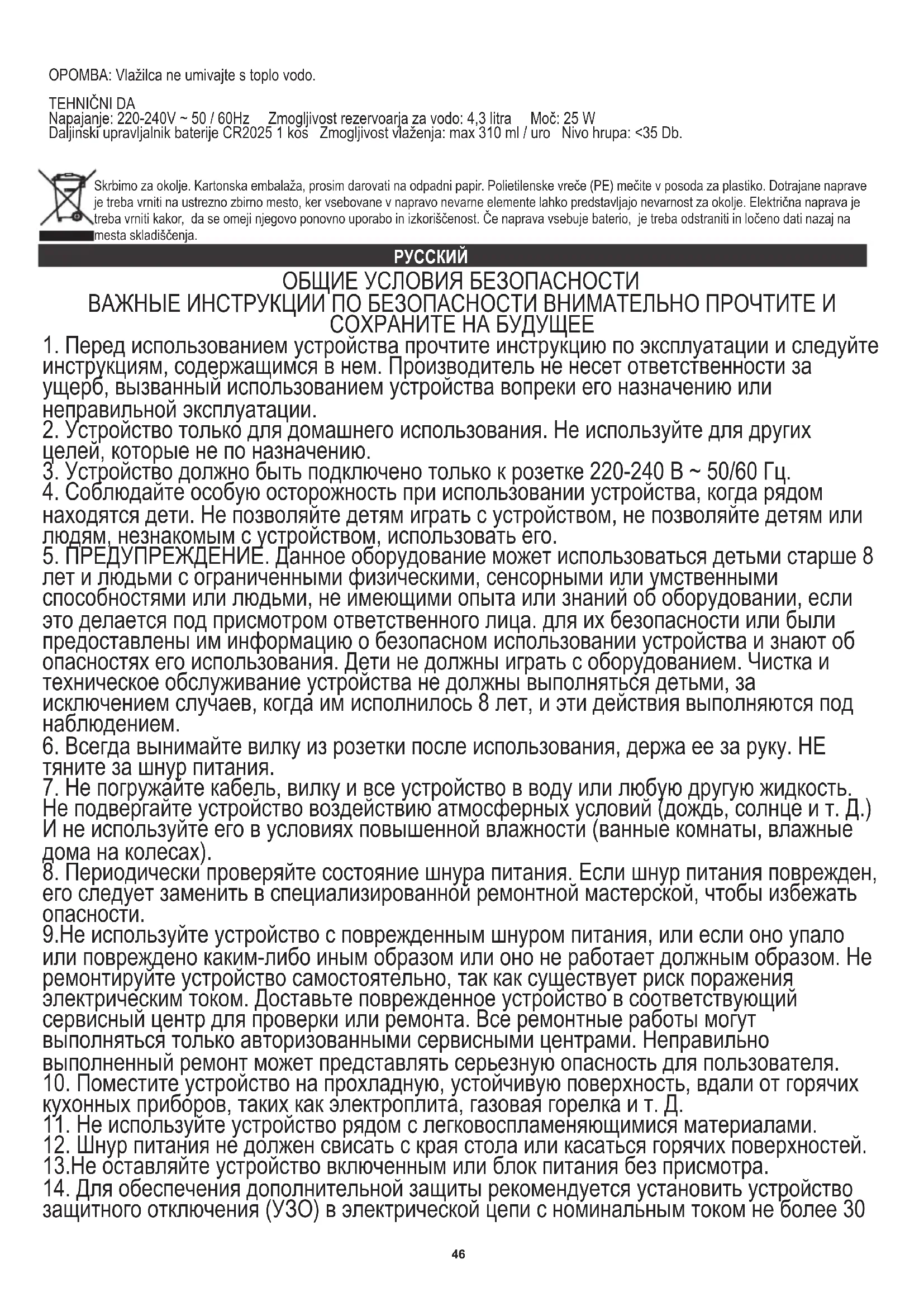 ПРИМЕЧАНИЕ. Не допускайте попадания влаги в основание увлажнителя. ПРИМЕЧАНИЕ. Не мойте увлажнитель теплой водой. ТЕХНИЧЕСКИЙ ДА Источник питания: 220-240В ~ 50 / 60Гц. Емкость резервуара для воды: 4,3 литра. Мощность: 25 Вт. Пульт дистанционного управления батареи CR2025 1 шт. Производительность увлажнения: макс. 310 мл / час Уровень шума: <35 дБ. Заботясь об окружающей среде.. Упаковку из картона передайте,пожалуйста, на макулатуру. Полиэтиленовые мешки (РЕ) выкидать в резервуар для пластмассы. Изношенное устройство надо передать в соответствующую точку хранения, так как находящиесяв устройствеопасные составляющие могут являться угрозой для окружающей среды. Электрическое устройство надо передать таким образом, чтобы ограничить его повторное употребление и использование. Если в устройстве находятся батареи, их надо вытянуть и передать в точку хранения отдельно. Устройство не выкидать в резервуар для коммунальных отходов!49 ČESKY