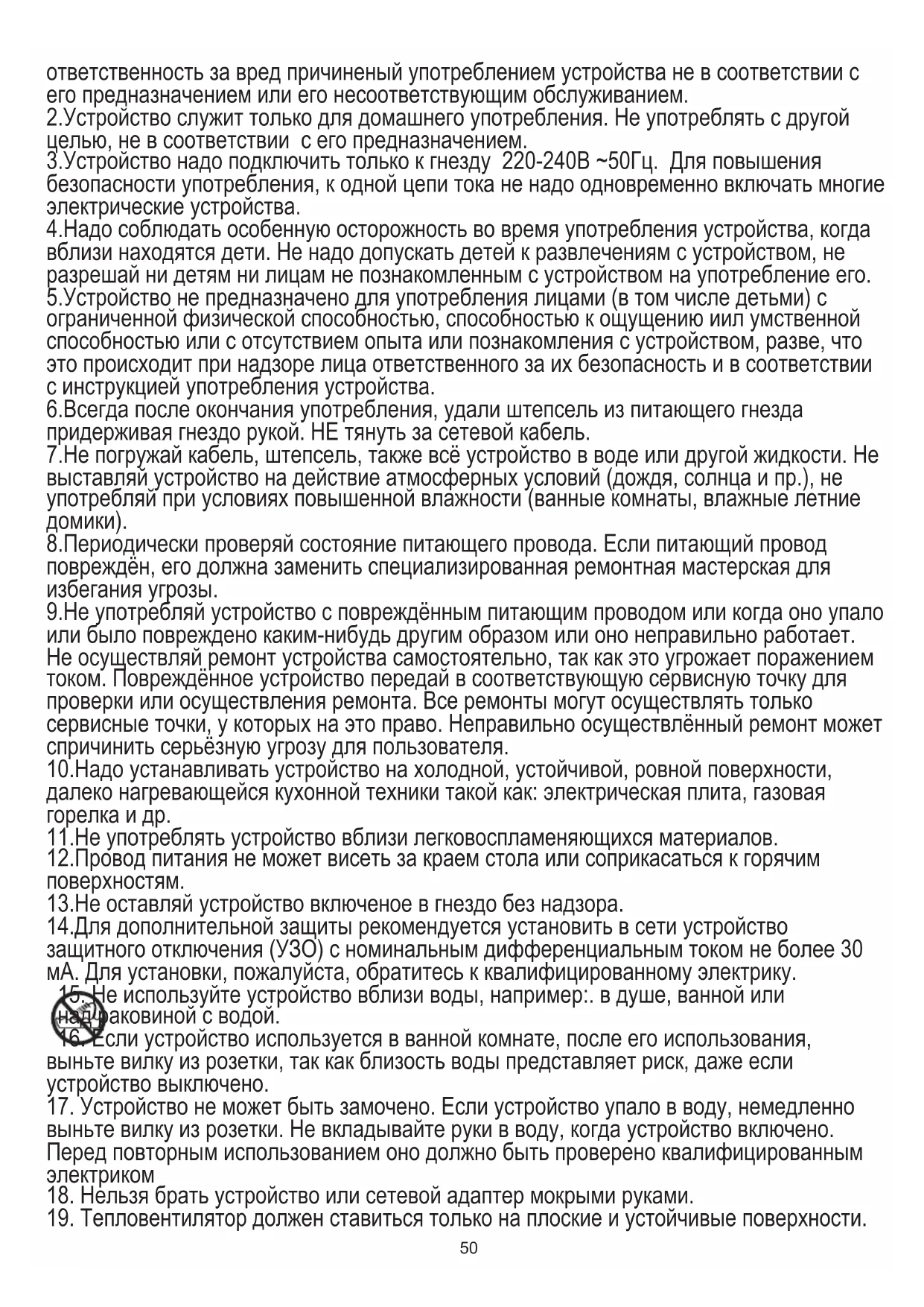 19. Тепловентилятор должен ставиться только на плоские и устойчивые поверхности.51