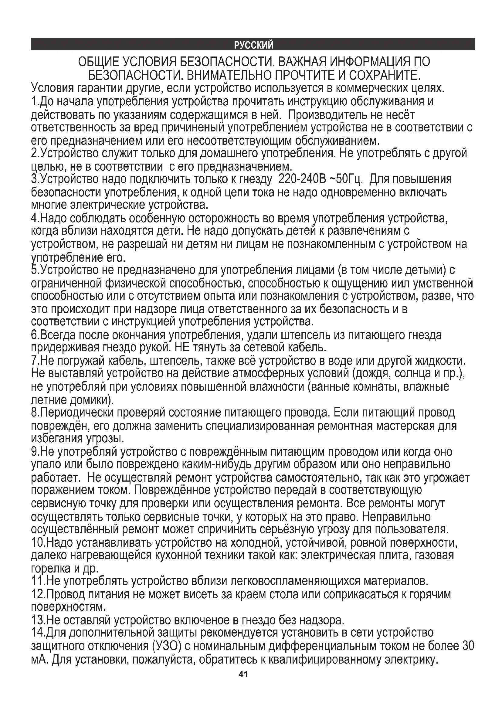 Vodimo brigu o prirodnom okolišu. Kartonsku ambalažu molimo prenijeti na otpadni papir. Polietilen (PE) vreće bacati u kontejner za plastiku. Istrošena oprema treba biti premještena na prikladno mjesto za pohranu, jer sadrže u ureađju opasne tvari mogu predstavljati opasnost za okoliš. Električni uređaj mora biti predat u takvom stanju da se smanji mogučnost njegove ponovne upotrebe. Ako vaš uređaj ima baterije, treba njih ukloniti i predati na mjesto za pohranu odvojeno. 40Условия гарантии другие, если устройство используется в коммерческих целях. 2.Устройство служит только для домашнего употребления. Не употреблять с другой целью, не в соответствии с его предназначением. 3.Устройство надо подключить только к гнезду 220-240В ~50Гц. Для повышения безопасности употребления, к одной цепи тока не надо одновременно включать многие электрические устройства. 1.До начала употребления устройства прочитать инструкцию обслуживания и действовать по указаниям содержащимся в ней. Производитель не несёт ответственность за вред причиненый употреблением устройства не в соответствии с его предназначением или его несоответствующим обслуживанием. ОБЩИЕ УСЛОВИЯ БЕЗОПАСНОСТИ. ВАЖНАЯ ИНФОРМАЦИЯ ПО БЕЗОПАСНОСТИ. ВНИМАТЕЛЬНО ПРОЧТИТЕ И СОХРАНИТЕ. 11.Не употреблять устройство вблизи легковоспламеняющихся материалов. 9.Не употребляй устройство с повреждённым питающим проводом или когда оно упало или было повреждено каким-нибудь другим образом или оно неправильно работает. Не осуществляй ремонт устройства самостоятельно, так как это угрожает поражением током. Повреждённое устройство передай в соответствующую сервисную точку для проверки или осуществления ремонта. Все ремонты могут осуществлять только сервисные точки, у которых на это право. Неправильно осуществлённый ремонт может спричинить серьёзную угрозу для пользователя. 8.Периодически проверяй состояние питающего провода. Если питающий провод повреждён, его должна заменить специализированная ремонтная мастерская для избегания угрозы. 7.Не погружай кабель, штепсель, также всё устройство в воде или другой жидкости. Не выставляй устройство на действие атмосферных условий (дождя, солнца и пр.), не употребляй при условиях повышенной влажности (ванные комнаты, влажные летние домики). 10.Надо устанавливать устройство на холодной, устойчивой, ровной поверхности, далеко нагревающейся кухонной техники такой как: электрическая плита, газовая горелка и др. 13.Не оставляй устройство включеное в гнездо без надзора. 14.Для дополнительной защиты рекомендуется установить в сети устройство защитного отключения (УЗО) с номинальным дифференциальным током не более 30 мА. Для установки, пожалуйста, обратитесь к квалифицированному электрику. 12.Провод питания не может висеть за краем стола или соприкасаться к горячим поверхностям. 4.Надо соблюдать особенную осторожность во время употребления устройства, когда вблизи находятся дети. Не надо допускать детей к развлечениям с устройством, не разрешай ни детям ни лицам не познакомленным с устройством на употребление его. 6.Всегда после окончания употребления, удали штепсель из питающего гнезда придерживая гнездо рукой. НЕ тянуть за сетевой кабель. 5.Устройство не предназначено для употребления лицами (в том числе детьми) с ограниченной физической способностью, способностью к ощущению иил умственной способностью или с отсутствием опыта или познакомления с устройством, разве, что это происходит при надзоре лица ответственного за их безопасность и в соответствии 