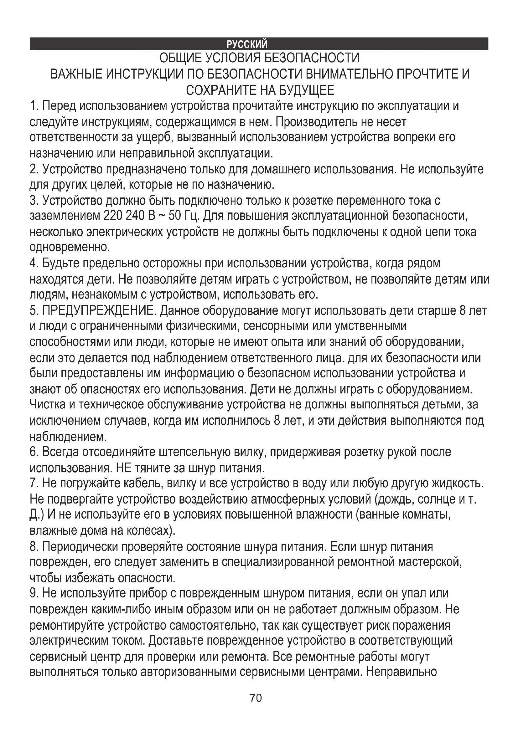 поврежден, его следует заменить в специализированной ремонтной мастерской, чтобы избежать опасности. ОБЩИЕ УСЛОВИЯ БЕЗОПАСНОСТИ