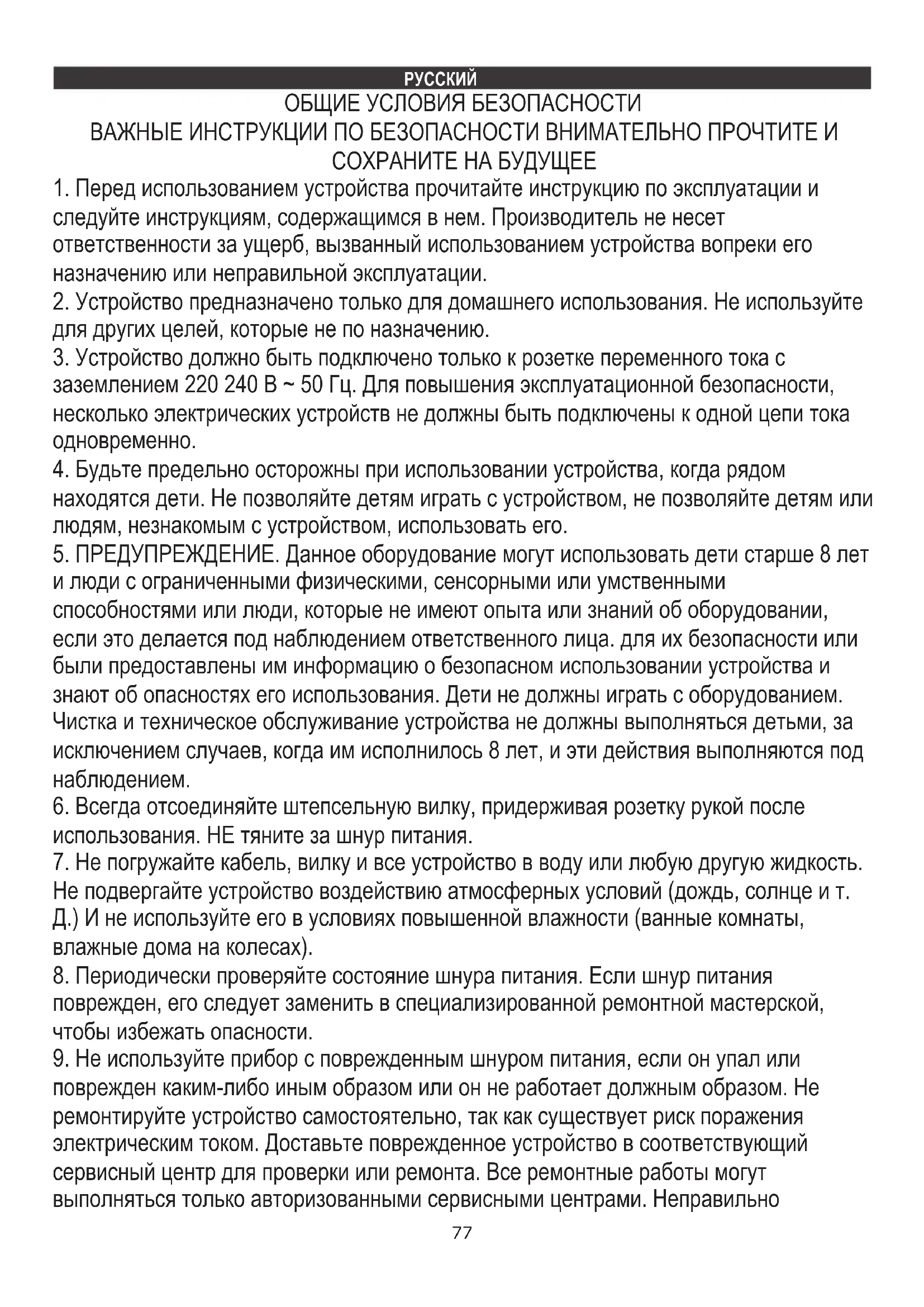 поврежден каким-либо иным образом или он не работает должным образом. Не ремонтируйте устройство самостоятельно, так как существует риск поражения электрическим током. Доставьте поврежденное устройство в соответствующий сервисный центр для проверки или ремонта. Все ремонтные работы могут выполняться только авторизованными сервисными центрами. Неправильно 77выполненный ремонт может представлять серьезную опасность для пользователя.