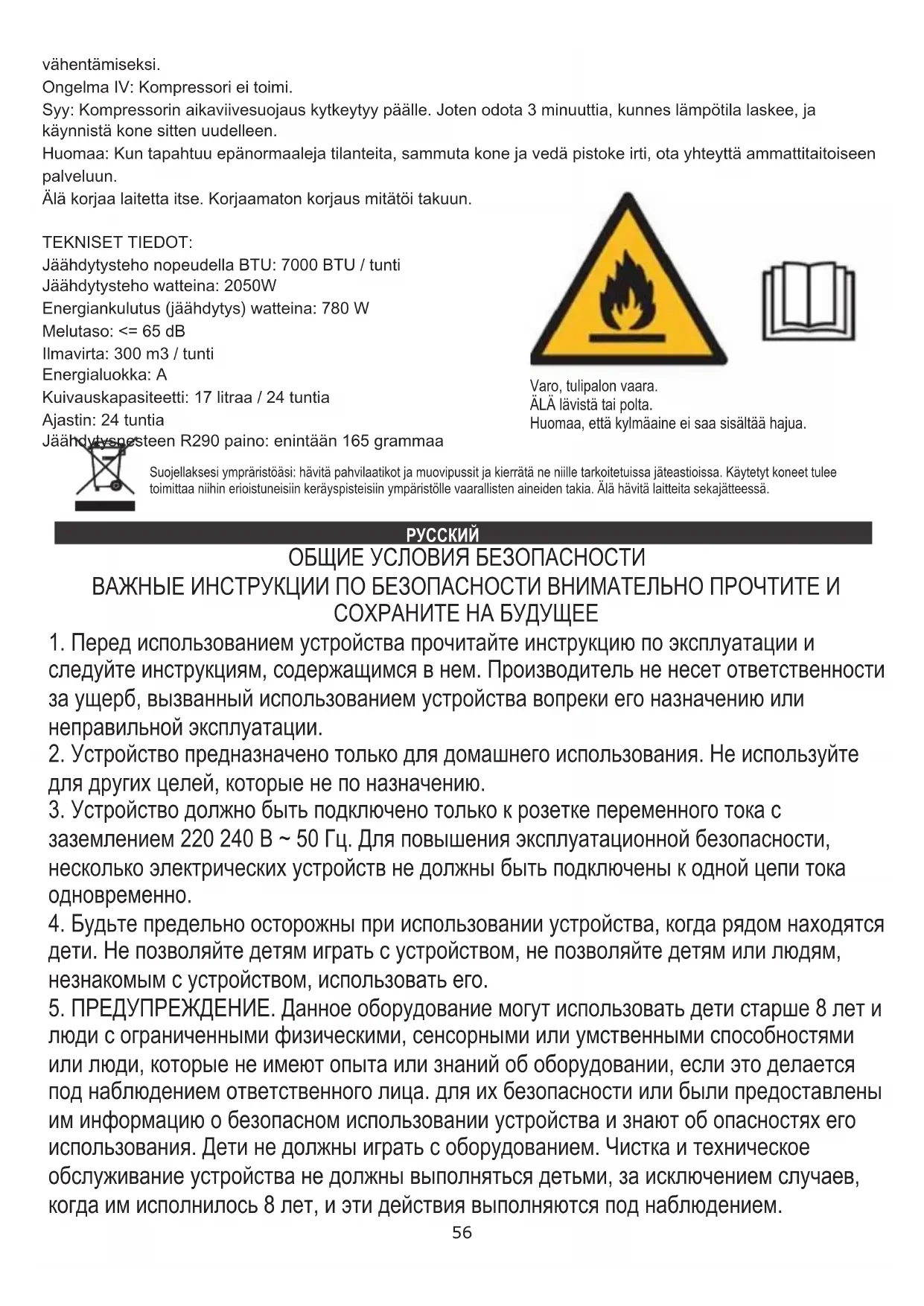 ПОИСК НЕИСПРАВНОСТЕЙ Проблема I .: Кондиционер не работает. 59Осторожно, опасность пожара. НЕ прокалывать и не сжигать. Помните, что хладагент не может содержать запах. Причина 1: нет электричества. Итак, включите его после подключения к электрической розетке. Причина 2: Индикатор полного контроля воды показывает «WF». Итак, слейте воду. Проблема II .: Устройство часто перезагружается. Причина 1: прямой солнечный свет. Итак, нарисованы шторы. Причина 2: Дверь и окна открыты, в комнате много источников тепла. Итак, закройте дверь и окна, выдвиньте источники тепла. Причина 3: фильтры слишком грязные. Итак, почистите или замените фильтры. Причина 4: Заблокирован впуск или выпуск воздуха. Итак, уберите засорение. Проблема III .: Большой шум Причина: устройство не размещено на плоской поверхности. Итак, положите устройство на ровное и жесткое место, чтобы уменьшить шум. Проблема IV .: Компрессор не работает. Причина: защита от задержки компрессора включена. Итак, подождите 3 минуты, пока температура не понизится, а затем перезапустите машину. Примечание: при возникновении нештатных ситуаций выключите машину и выньте вилку из розетки, а затем обратитесь за помощью в профессиональную службу. Не ремонтируйте устройство самостоятельно. Неквалифицированный ремонт приведет к аннулированию гарантии. ТЕХНИЧЕСКИЕ ДАННЫЕ: Холодопроизводительность в БТЕ: 7000 БТЕ / час Холодопроизводительность в ваттах: 2050 Вт Энергопотребление (охлаждение) в ваттах: 780 Вт Уровень шума: <= 65 дБ Расход воздуха: 300 м3 / час Энергетический класс: A Производительность сушки: 17 литров / 24 часа Таймер: 24 часа Вес охлаждающей жидкости R290: максимум 165 грамм Заботясь об окружающей среде.. Упаковку из картона передайте,пожалуйста, на макулатуру. Полиэтиленовые мешки (РЕ) выкидать в резервуар для пластмассы. Изношенное устройство надо передать в соответствующую точку хранения, так как находящиесяв устройствеопасные составляющие могут являться угрозой для окружающей среды. Электрическое устройство надо передать таким образом, чтобы ограничить его повторное употребление и использование. Если в устройстве находятся батареи, их надо вытянуть и передать в точку хранения отдельно. Устройство не выкидать в резервуар для коммунальных отходов! 60ITALIANO