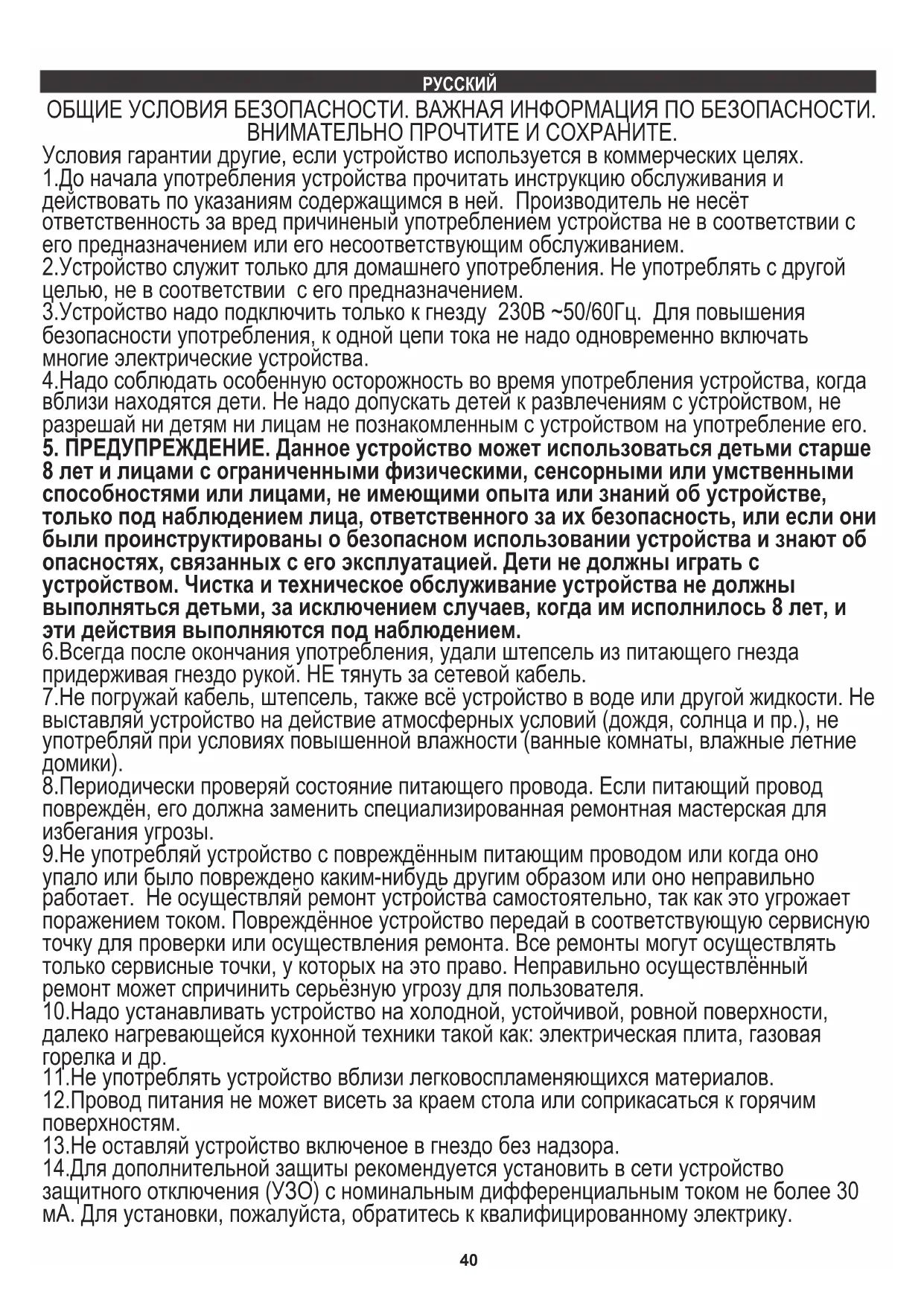 8 лет и лицами с ограниченными физическими, сенсорными или умственными способностями или лицами, не имеющими опыта или знаний об устройстве, только под наблюдением лица, ответственного за их безопасность, или если они были проинструктированы о безопасном использовании устройства и знают об опасностях, связанных с его эксплуатацией. Дети не должны играть с устройством. Чистка и техническое обслуживание устройства не должны выполняться детьми, за исключением случаев, когда им исполнилось 8 лет, и эти действия выполняются под наблюдением. 8.Периодически проверяй состояние питающего провода. Если питающий провод повреждён, его должна заменить специализированная ремонтная мастерская для избегания угрозы. 10.Надо устанавливать устройство на холодной, устойчивой, ровной поверхности, далеко нагревающейся кухонной техники такой как: электрическая плита, газовая горелка и др. 11.Не употреблять устройство вблизи легковоспламеняющихся материалов. 12.Провод питания не может висеть за краем стола или соприкасаться к горячим поверхностям. 13.Не оставляй устройство включеное в гнездо без надзора. РУССКИЙ41