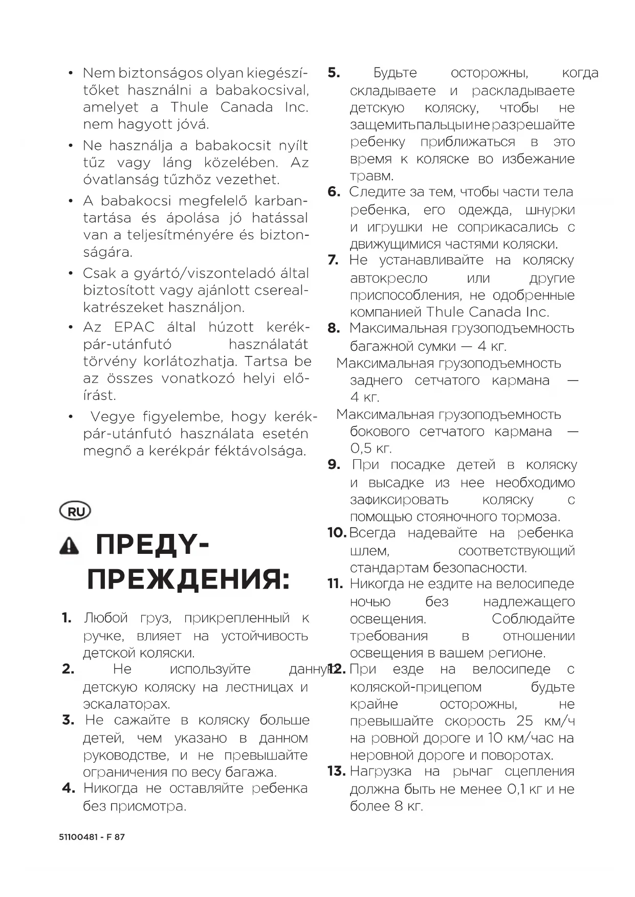 В предупреждениях приведены инструкции по безопасному использованию детской коляски Thule. Невыполнение данных инструкций может привести к несчастному случаю, смерти, а также стать причиной серьезных травм для вас и(или) вашего