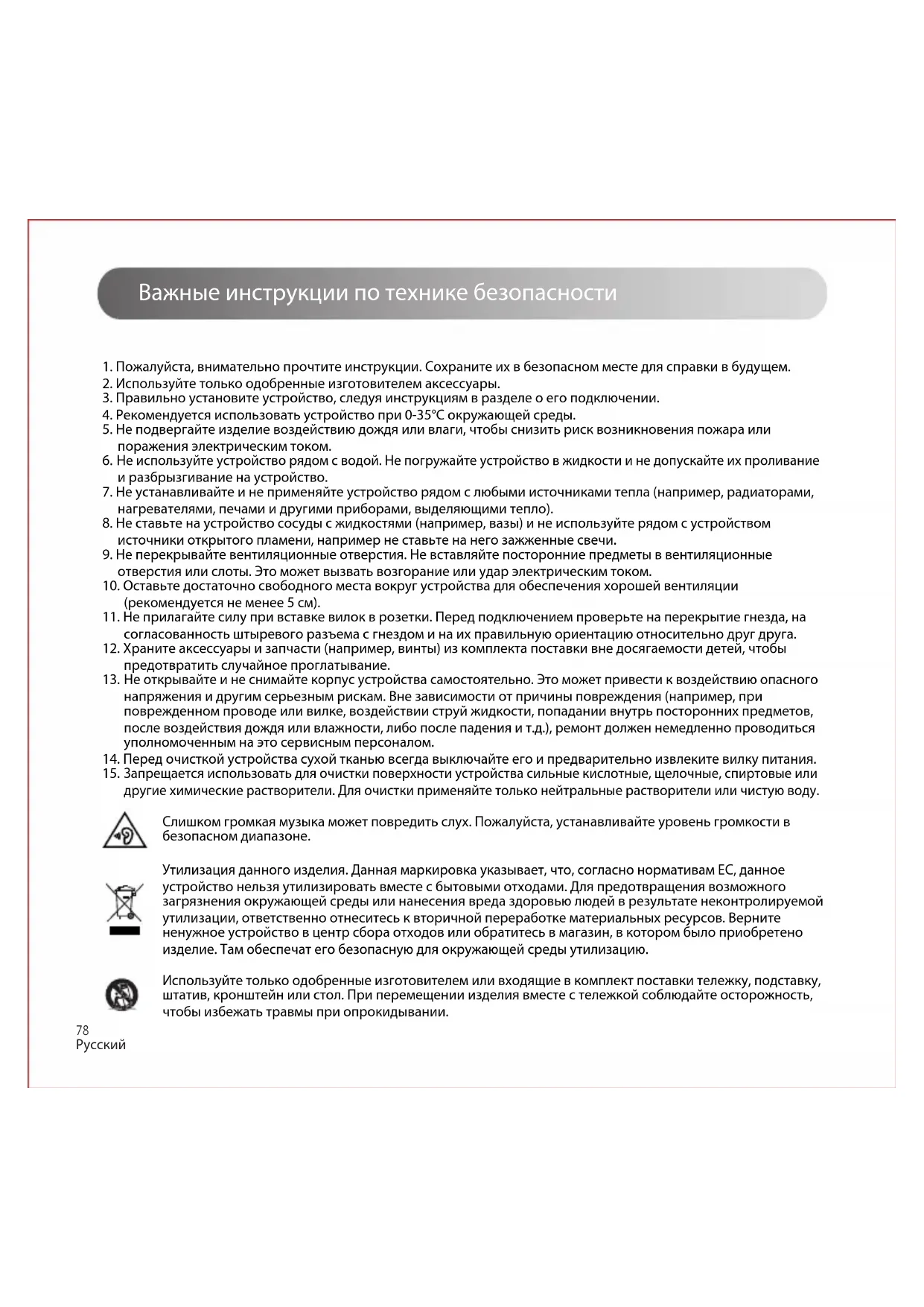 Слишком громкая музыка может повредить слух. Пожалуйста, устанавливайте уровень громкости в безопасном диапазоне. Утилизация данного изделия. Данная маркировка указывает, что, согласно нормативам ЕС, данное устройство нельзя утилизировать вместе с бытовыми отходами. Для предотвращения возможного загрязнения окружающей среды или нанесения вреда здоровью людей в результате неконтролируемой утилизации, ответственно отнеситесь к вторичной переработке материальных ресурсов. Верните ненужное устройство в центр сбора отходов или обратитесь в магазин, в котором было приобретено изделие. Там обеспечат его безопасную для окружающей среды утилизацию. Используйте только одобренные изготовителем или входящие в комплект поставки тележку, подставку, штатив, кронштейн или стол. При перемещении изделия вместе с тележкой соблюдайте осторожность, чтобы избежать травмы при опрокидывании.