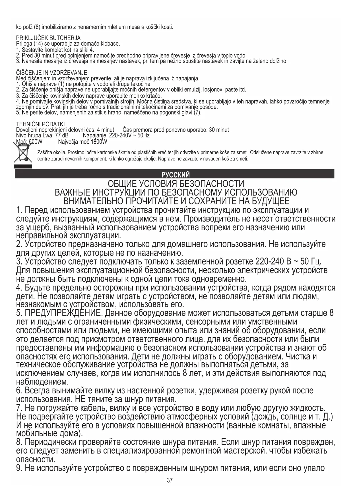 ПРЕДУПРЕЖДЕНИЕ! Всегда отсоединяйте устройство от источника питания во время сборки, разборки, чистки и, когда они находятся без присмотра.