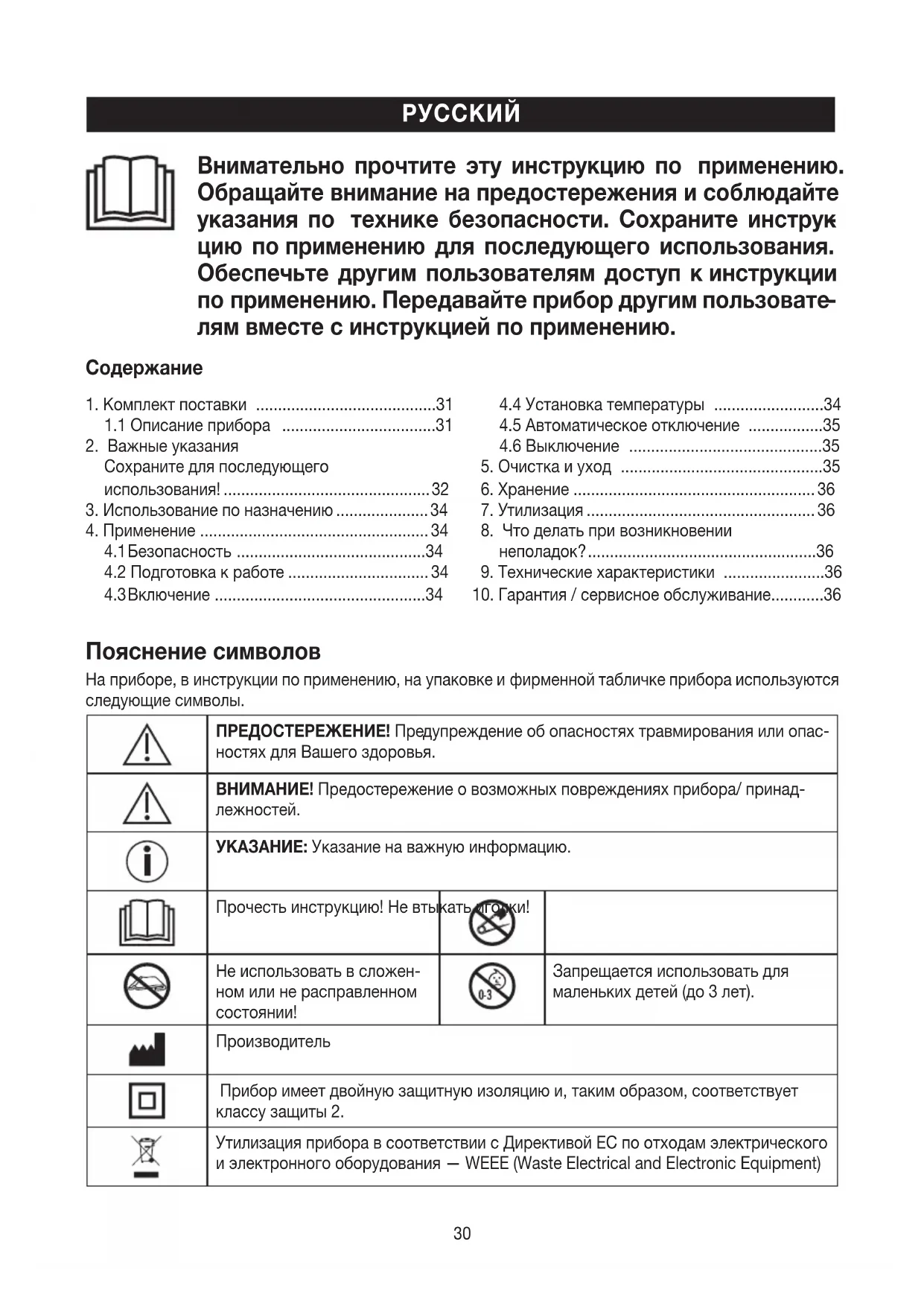 Запрещается использовать для маленьких детей (до 3 лет). Производитель Прибор имеет двойную защитную изоляцию и, таким образом, соответствует классу защиты 2. Утилизация прибора в соответствии с Директивой ЕС по отходам электрического и электронного оборудования— WEEE (Waste Electrical and Electronic Equipment) Внимательно прочтите эту инструкцию по применению. Обращайте внимание напредостережения исоблюдайте указания по технике безопасности. Сохраните инструк