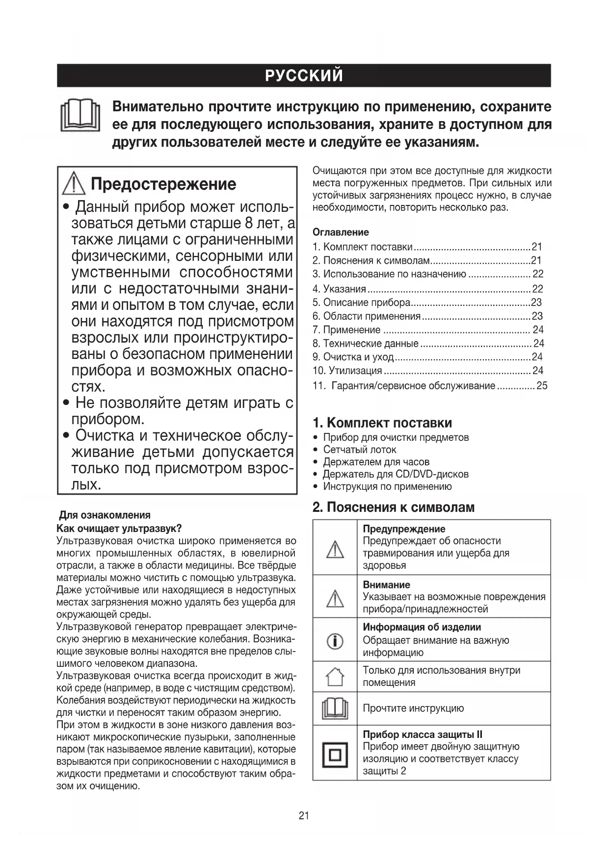 Прибор предназначен для очистки водонепроницае- мых твердых предметов, таких, как украшения, очки, часы, монеты, столовые приборы, режущие головки электробритв, компакт-диски и т.д. (см. главу Обла- сти применения). Этот прибор предназначен не для профессионального применения, а исключительно для использования в домашних условиях!