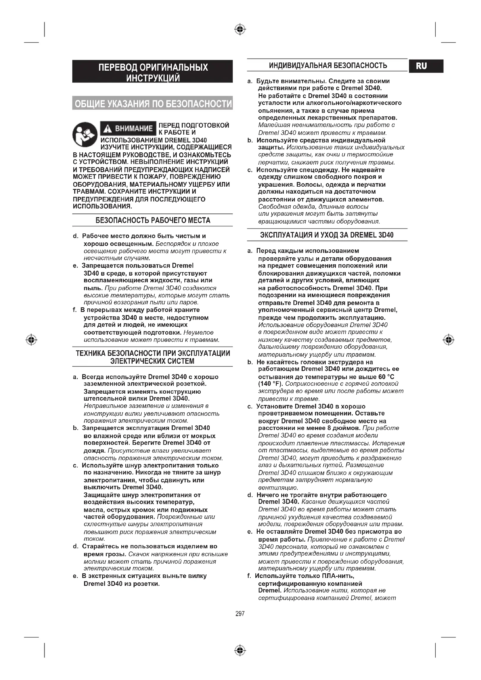 ИСПОЛЬЗОВАНИЕМ DREMEL 3D40 ИЗУЧИТЕ ИНСТРУКЦИИ, СОДЕРЖАЩИЕСЯ В НАСТОЯЩЕМ РУКОВОДСТВЕ, И ОЗНАКОМЬТЕСЬ С УСТРОЙСТВОМ. НЕВЫПОЛНЕНИЕ ИНСТРУКЦИЙ И ТРЕБОВАНИЙ ПРЕДУПРЕЖДАЮЩИХ НАДПИСЕЙ МОЖЕТ ПРИВЕСТИ К ПОЖАРУ, ПОВРЕЖДЕНИЮ ОБОРУДОВАНИЯ, МАТЕРИАЛЬНОМУ УЩЕРБУ ИЛИ ТРАВМАМ. СОХРАНИТЕ ИНСТРУКЦИИ И ПРЕДУПРЕЖДЕНИЯ ДЛЯ ПОСЛЕДУЮЩЕГО ИСПОЛЬЗОВАНИЯ. БЕЗОПАСНОСТЬ РАБОЧЕГО МЕСТА d. Рабочее место должно быть чистым и хорошо освещенным. Беспорядок и плохое освещение рабочего места могут привести к несчастным случаям. e. Запрещается пользоваться Dremel 3D40 в среде, в которой присутствуют воспламеняющиеся жидкости, газы или пыль. При работе Dremel 3D40 создаются высокие температуры, которые могут стать причиной возгорания пыли или паров. f. В перерывах между работой храните устройства 3D40 в месте, недоступном для детей и людей, не имеющих соответствующей подготовки. Неумелое использование может привести к травмам. ТЕХНИКА БЕЗОПАСНОСТИ ПРИ ЭКСПЛУАТАЦИИ ЭЛЕКТРИЧЕСКИХ СИСТЕМ a. Всегда используйте Dremel 3D40 с хорошо заземленной электрической розеткой. Запрещается изменять конструкцию штепсельной вилки Dremel 3D40. Неправильное заземление и изменения в конструкции вилки увеличивают опасность поражения электрическим током. b. Запрещается эксплуатация Dremel 3D40 во влажной среде или вблизи от мокрых поверхностей. Берегите Dremel 3D40 от дождя. Присутствие влаги увеличивает опасность поражения электрическим током. c. Используйте шнур электропитания только по назначению. Никогда не тяните за шнур электропитания, чтобы сдвинуть или выключить Dremel 3D40. Защищайте шнур электропитания от воздействия высоких температур, масла, острых кромок или подвижных частей оборудования. Поврежденные или схлестнутые шнуры электропитания повышают риск поражения электрическим