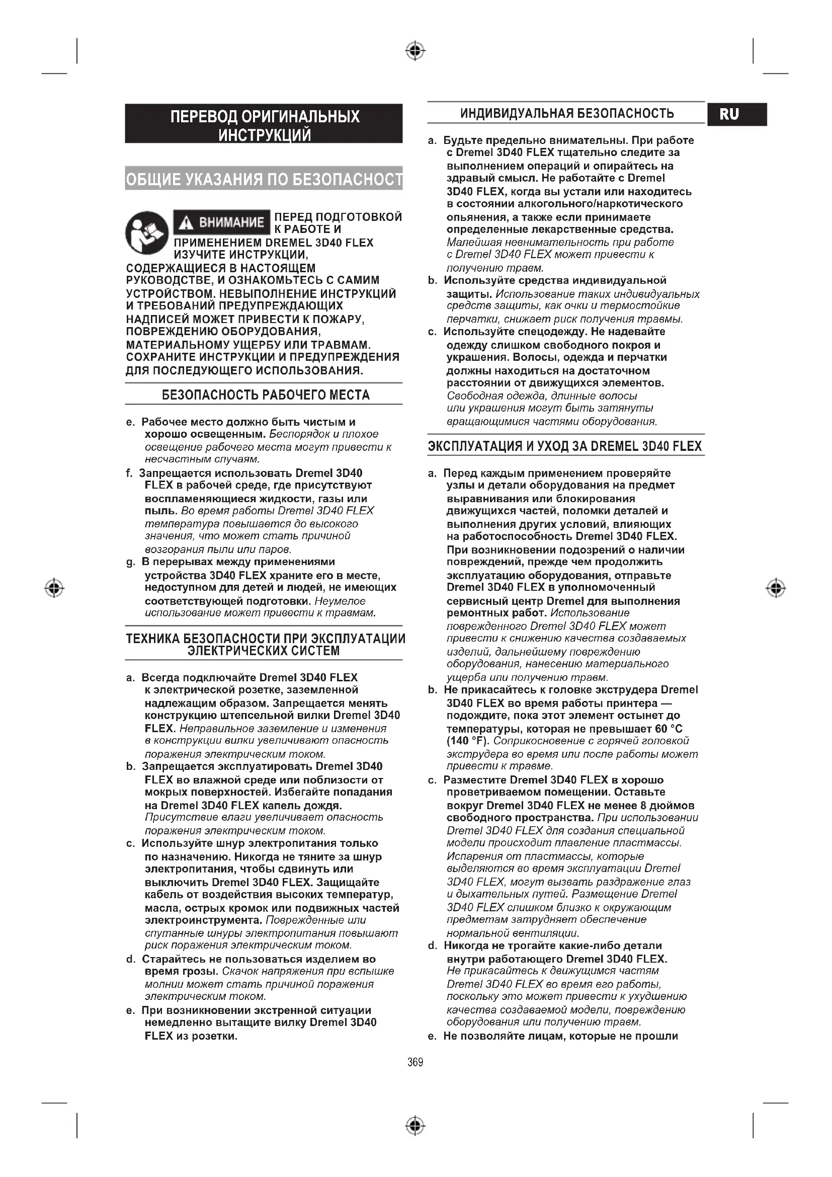 ИЗУЧИТЕ ИНСТРУКЦИИ, СОДЕРЖАЩИЕСЯ В НАСТОЯЩЕМ РУКОВОДСТВЕ, И ОЗНАКОМЬТЕСЬ С САМИМ УСТРОЙСТВОМ. НЕВЫПОЛНЕНИЕ ИНСТРУКЦИЙ И ТРЕБОВАНИЙ ПРЕДУПРЕЖДАЮЩИХ НАДПИСЕЙ МОЖЕТ ПРИВЕСТИ К ПОЖАРУ, ПОВРЕЖДЕНИЮ ОБОРУДОВАНИЯ, МАТЕРИАЛЬНОМУ УЩЕРБУ ИЛИ ТРАВМАМ. СОХРАНИТЕ ИНСТРУКЦИИ И ПРЕДУПРЕЖДЕНИЯ ДЛЯ ПОСЛЕДУЮЩЕГО ИСПОЛЬЗОВАНИЯ. БЕЗОПАСНОСТЬ РАБОЧЕГО МЕСТА e. Рабочее место должно быть чистым и хорошо освещенным. Беспорядок и плохое освещение рабочего места могут привести к несчастным случаям. f. Запрещается использовать Dremel 3D40 FLEX в рабочей среде, где присутствуют воспламеняющиеся жидкости, газы или пыль. Во время работы Dremel 3D40 FLEX температура повышается до высокого значения, что может стать причиной возгорания пыли или паров. g. В перерывах между применениями устройства 3D40 FLEX храните его в месте, недоступном для детей и людей, не имеющих соответствующей подготовки. Неумелое использование может привести к травмам. ТЕХНИКА БЕЗОПАСНОСТИ ПРИ ЭКСПЛУАТАЦИИ ЭЛЕКТРИЧЕСКИХ СИСТЕМ a. Всегда подключайте Dremel 3D40 FLEX к электрической розетке, заземленной надлежащим образом. Запрещается менять конструкцию штепсельной вилки Dremel 3D40 FLEX. Неправильное заземление и изменения в конструкции вилки увеличивают опасность поражения электрическим током. b. Запрещается эксплуатировать Dremel 3D40 FLEX во влажной среде или поблизости от мокрых поверхностей. Избегайте попадания на Dremel 3D40 FLEX капель дождя. Присутствие влаги увеличивает опасность поражения электрическим током. c. Используйте шнур электропитания только по назначению. Никогда не тяните за шнур электропитания, чтобы сдвинуть или выключить Dremel 3D40 FLEX. Защищайте кабель от воздействия высоких температур, масла, острых кромок или подвижных частей электроинструмента. Поврежденные или спутанные шнуры электропитания повышают риск поражения электрическим током. d. Старайтесь не пользоваться изделием во время грозы. Скачок напряжения при вспышке молнии может стать причиной поражения электрическим током. e. При возникновении экстренной ситуации немедленно вытащите вилку Dremel 3D40 FLEX из розетки. ИНДИВИДУАЛЬНАЯ БЕЗОПАСНОСТЬ a. Будьте предельно внимательны. При работе с Dremel 3D40 FLEX тщательно следите за выполнением операций и опирайтесь на здравый смысл. Не работайте с Dremel 3D40 FLEX, когда вы устали или находитесь в состоянии алкогольного/наркотического опьянения, а также если принимаете определенные лекарственные средства. Малейшая невнимательность при работе с Dremel 3D40 FLEX может привести к получению травм. b. Используйте средства индивидуальной защиты. Использование таких индивидуальных средств защиты, как очки и термостойкие перчатки, снижает риск получения травмы. c. Используйте спецодежду. Не надевайте одежду слишком свободного покроя и украшения. Волосы, одежда и перчатки должны находиться на достаточном расстоянии от движущихся элементов. Свободная одежда, длинные волосы или украшения могут быть затянуты вращающимися частями оборудования.