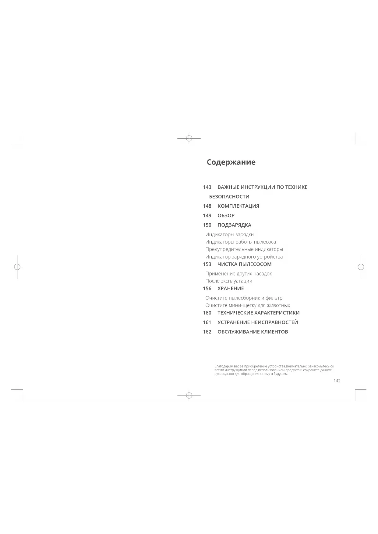 143 ВАЖНЫЕИНСТРУКЦИИПОТЕХНИКЕ БЕЗОПАСНОСТИ 148 КОМПЛЕКТАЦИЯ 149 ОБЗОР 150 ПОДЗАРЯДКА Индикаторы зарядки Индикаторы работы пылесоса Предупредительные индикаторы Индикатор зарядного устройства 153 ЧИСТКАПЫЛЕСОСОМ Применение других насадок После эксплуатации 156 ХРАНЕНИЕ Очистите пылесборник и фильтр Очистите мини-щетку для животных 160 ТЕХНИЧЕСКИЕХАРАКТЕРИСТИКИ 161 УСТРАНЕНИЕНЕИСПРАВНОСТЕЙ 162 ОБСЛУЖИВАНИЕКЛИЕНТОВ143
