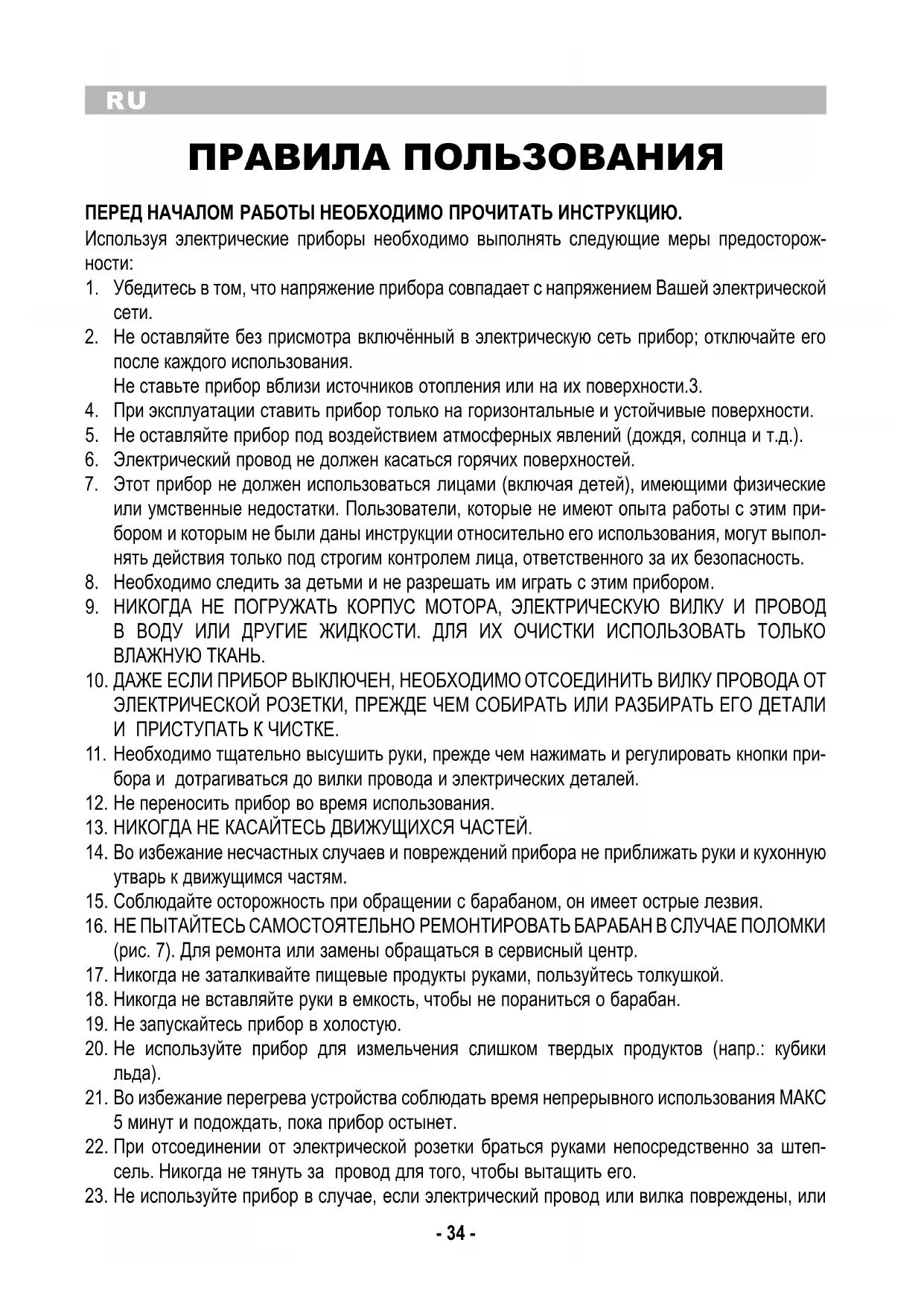 Не оставляйте без присмотра включённый в электрическую сеть прибор; отключайте его 2. после каждого использования. Не ставьте прибор вблизи источников отопления или на их поверхности.3. При эксплуатации ставить прибор только на горизонтальные и устойчивые поверхности.4. Не оставляйте прибор под воздействием атмосферных явлений (дождя, солнца и т.д.). 5. Электрический провод не должен касаться горячих поверхностей.6. Этот прибор не должен использоваться лицами (включая детей), имеющими физические 7. или умственные недостатки. Пользователи, которые не имеют опыта работы с этим при- бором и которым не были даны инструкции относительно его использования, могут выпол- нять действия только под строгим контролем лица, ответственного за их безопасность. Необходимо следить за детьми и не разрешать им играть с этим прибором. 8. НИКОГДА НЕ ПОГРУЖАТЬ КОРПУС МОТОРА, ЭЛЕКТРИЧЕСКУЮ ВИЛКУ И ПРОВОД 9. В ВОДУ ИЛИ ДРУГИЕ ЖИДКОСТИ. ДЛЯ ИХ ОЧИСТКИ ИСПОЛЬЗОВАТЬ ТОЛЬКО ВЛАЖНУЮ ТКАНЬ. ДАЖЕ ЕСЛИ ПРИБОР ВЫКЛЮЧЕН, НЕОБХОДИМО ОТСОЕДИНИТЬ ВИЛКУ ПРОВОДА ОТ 10. ЭЛЕКТРИЧЕСКОЙ РОЗЕТКИ, ПРЕЖДЕ ЧЕМ СОБИРАТЬ ИЛИ РАЗБИРАТЬ ЕГО ДЕТАЛИ И ПРИСТУПАТЬ К ЧИСТКЕ. Необходимо тщательно высушить руки, прежде чем нажимать и регулировать кнопки при-11. бора и дотрагиваться до вилки провода и электрических деталей. Не переносить прибор во время использования.12. НИКОГДА НЕ КАСАЙТЕСЬ ДВИЖУЩИХСЯ ЧАСТЕЙ.13. Во избежание несчастных случаев и повреждений прибора не приближать руки и кухонную 14. утварь к движущимся частям. Соблюдайте осторожность при обращении с барабаном, он имеет острые лезвия.15. НЕ ПЫТАЙТЕСЬ САМОСТОЯТЕЛЬНО РЕМОНТИРОВАТЬ БАРАБАН В СЛУЧАЕ ПОЛОМКИ 16. (рис. 7). Для ремонта или замены обращаться в сервисный центр. Никогда не заталкивайте пищевые продукты руками, пользуйтесь толкушкой.17. Никогда не вставляйте руки в емкость, чтобы не пораниться о барабан.18. Не запускайтесь прибор в холостую.19. Не используйте прибор для измельчения слишком твердых продуктов (напр.: кубики 20.
