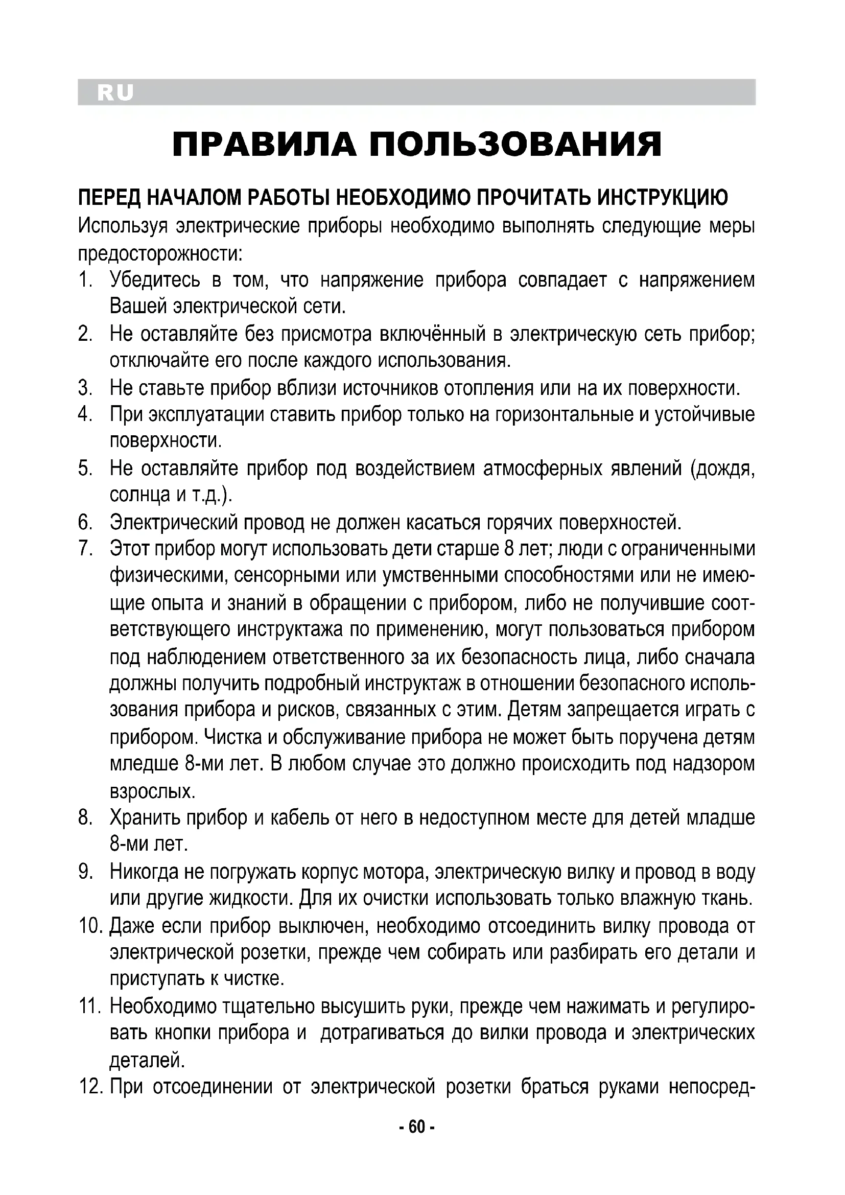 ПРАВИЛА ПОЛЬЗОВАНИЯ ПЕРЕД НАЧАЛОМ РАБОТЫ НЕОБХОДИМО ПРОЧИТАТЬ ИНСТРУКЦИЮ Используя электрические приборы необходимо выполнять следующие меры предосторожности: Убедитесь в том, что напряжение прибора совпадает с напряжением 1. Вашей электрической сети. Не оставляйте без присмотра включённый в электрическую сеть прибор; 2. отключайте его после каждого использования. Не ставьте прибор вблизи источников отопления или на их поверхности.