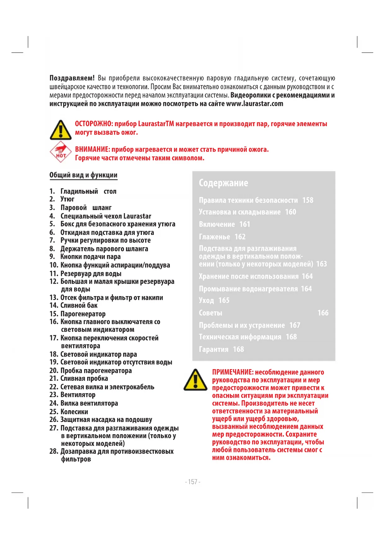 Правила техники безопасности 158 Установка и складывание 160 Включение 161 Глаженье 162 Подставка для разглаживания одежды в вертикальном полож- ении (только у некоторых моделей) 163 Хранение после использования 164 Промывание водонагревателя 164 Уход 165 Советы 166 Проблемы и их устранение 167 Техническая информация 168 Гарантия 168 Поздравляем! Вы приобрели высококачественную паровую гладильную систему, сочетающую швейцарское качество и технологии. Просим Вас внимательно ознакомиться с данным руководством и с мерами предосторожности перед началом эксплуатации системы. Видеоролики с рекомендациями и инструкцией по эксплуатации можно посмотреть на сайте www.laurastar.com Общий вид и функции