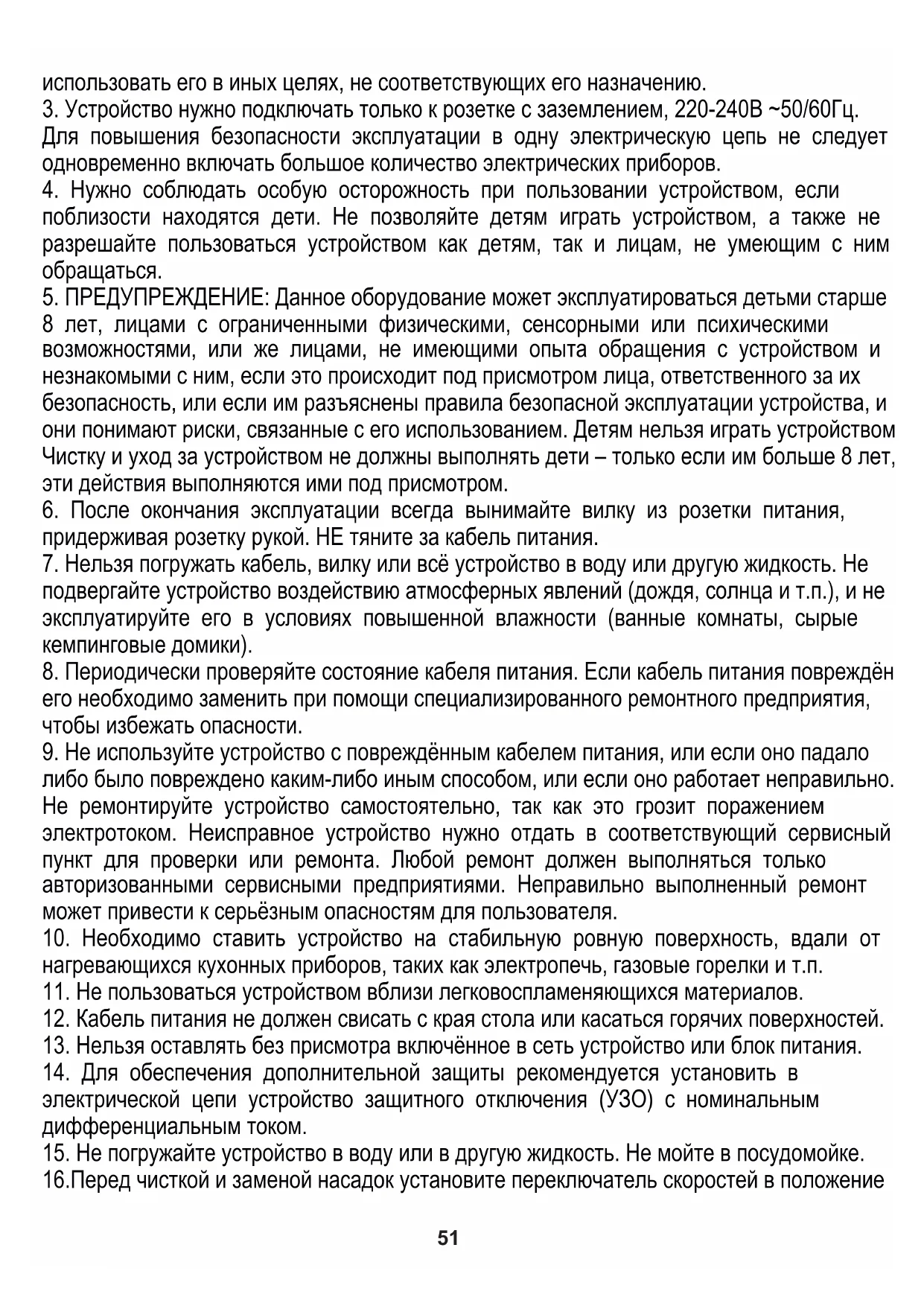 и действуйте согласно содержащимся в нём указаниям. Производитель не несёт ответственности за ущерб, причинённый в связи с использованием устройства не по назначению или с его ненадлежащим обслуживанием. ВАЖНЫЕ ИНСТРУКЦИИ, КАСАЮЩИЕСЯ БЕЗОПАСНОСТИ ПРИ ЭКСПЛУАТАЦИИ ВНИМАТЕЛЬНО ПРОЧИТАЙТЕ И СОХРАНИТЕ НА БУДУЩЕЕ РУССКИЙ51 использовать его в иных целях, не соответствующих его назначению.