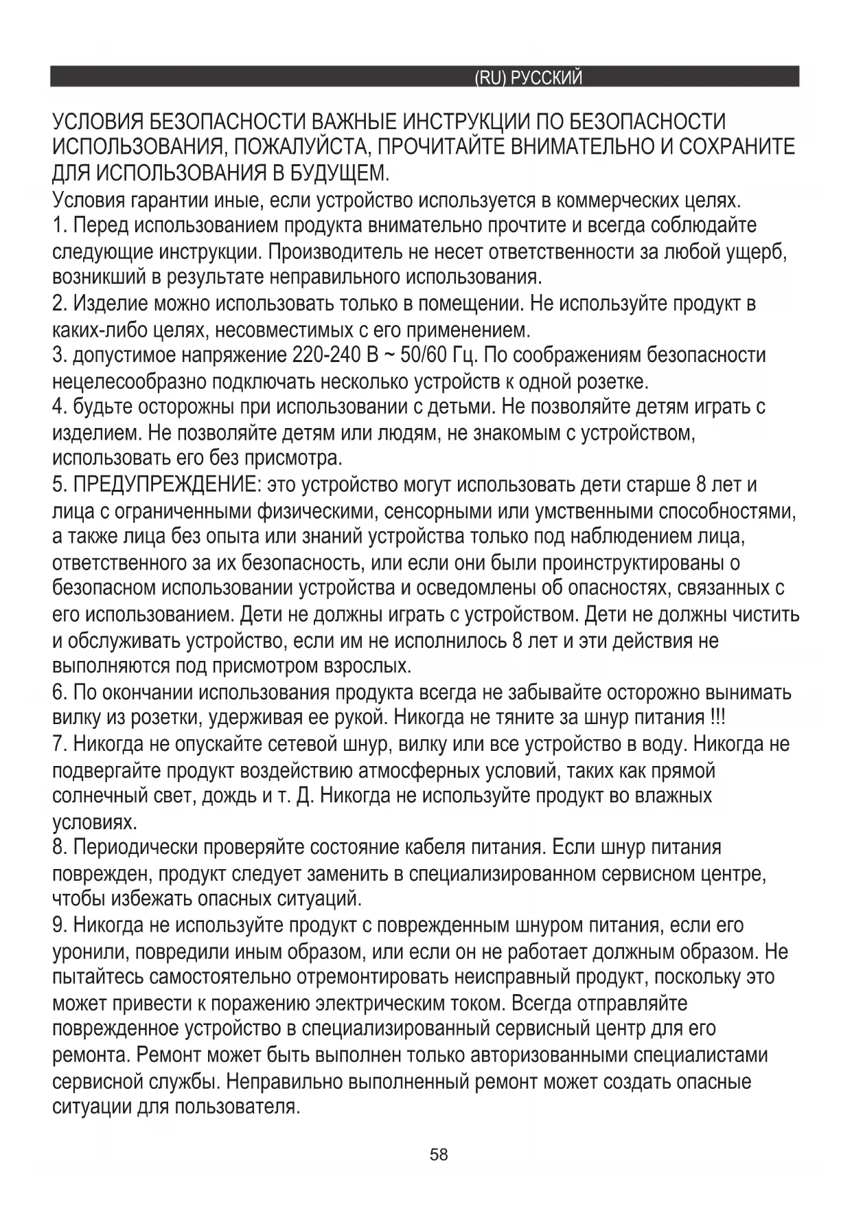 уронили, повредили иным образом, или если он не работает должным образом. Не пытайтесь самостоятельно отремонтировать неисправный продукт, поскольку это может привести к поражению электрическим током. Всегда отправляйте поврежденное устройство в специализированный сервисный центр для его ремонта. Ремонт может быть выполнен только авторизованными специалистами сервисной службы. Неправильно выполненный ремонт может создать опасные ситуации для пользователя. (RU) РУССКИЙ(RU) РУССКИЙ59