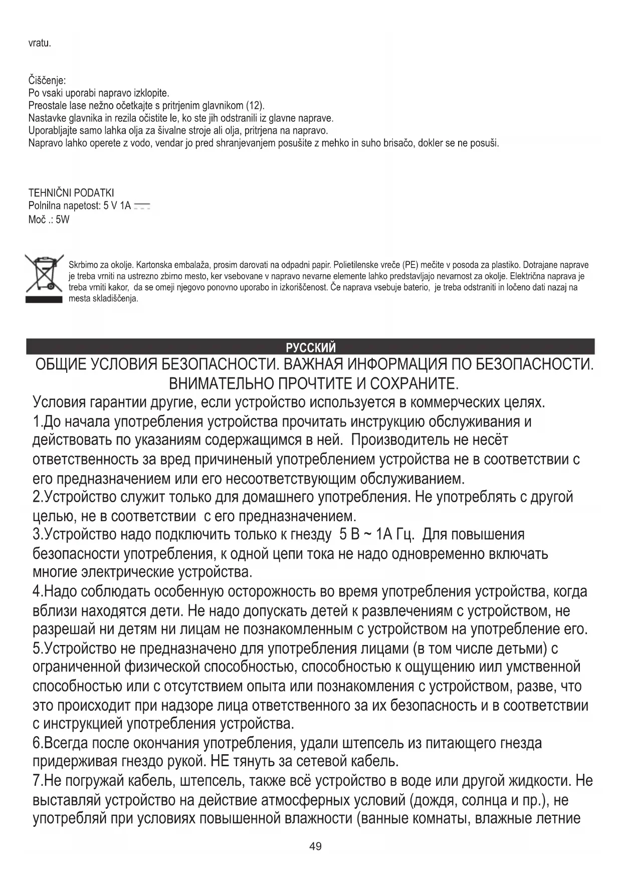 ОБЩИЕ УСЛОВИЯ БЕЗОПАСНОСТИ. ВАЖНАЯ ИНФОРМАЦИЯ ПО БЕЗОПАСНОСТИ. ВНИМАТЕЛЬНО ПРОЧТИТЕ И СОХРАНИТЕ. Условия гарантии другие, если устройство используется в коммерческих целях. 1.До начала употребления устройства прочитать инструкцию обслуживания и действовать по указаниям содержащимся в ней. Производитель не несёт ответственность за вред причиненый употреблением устройства не в соответствии с его предназначением или его несоответствующим обслуживанием. 2.Устройство служит только для домашнего употребления. Не употреблять с другой целью, не в соответствии с его предназначением. 3.Устройство надо подключить только к гнезду 5 В ~ 1A Гц. Для повышения безопасности употребления, к одной цепи тока не надо одновременно включать многие электрические устройства. 4.Надо соблюдать особенную осторожность во время употребления устройства, когда вблизи находятся дети. Не надо допускать детей к развлечениям с устройством, не разрешай ни детям ни лицам не познакомленным с устройством на употребление его. 5.Устройство не предназначено для употребления лицами (в том числе детьми) с ограниченной физической способностью, способностью к ощущению иил умственной способностью или с отсутствием опыта или познакомления с устройством, разве, что это происходит при надзоре лица ответственного за их безопасность и в соответствии с инструкцией употребления устройства. 6.Всегда после окончания употребления, удали штепсель из питающего гнезда придерживая гнездо рукой. НЕ тянуть за сетевой кабель. 7.Не погружай кабель, штепсель, также всё устройство в воде или другой жидкости. Не выставляй устройство на действие атмосферных условий (дождя, солнца и пр.), не употребляй при условиях повышенной влажности (ванные комнаты, влажные летние50