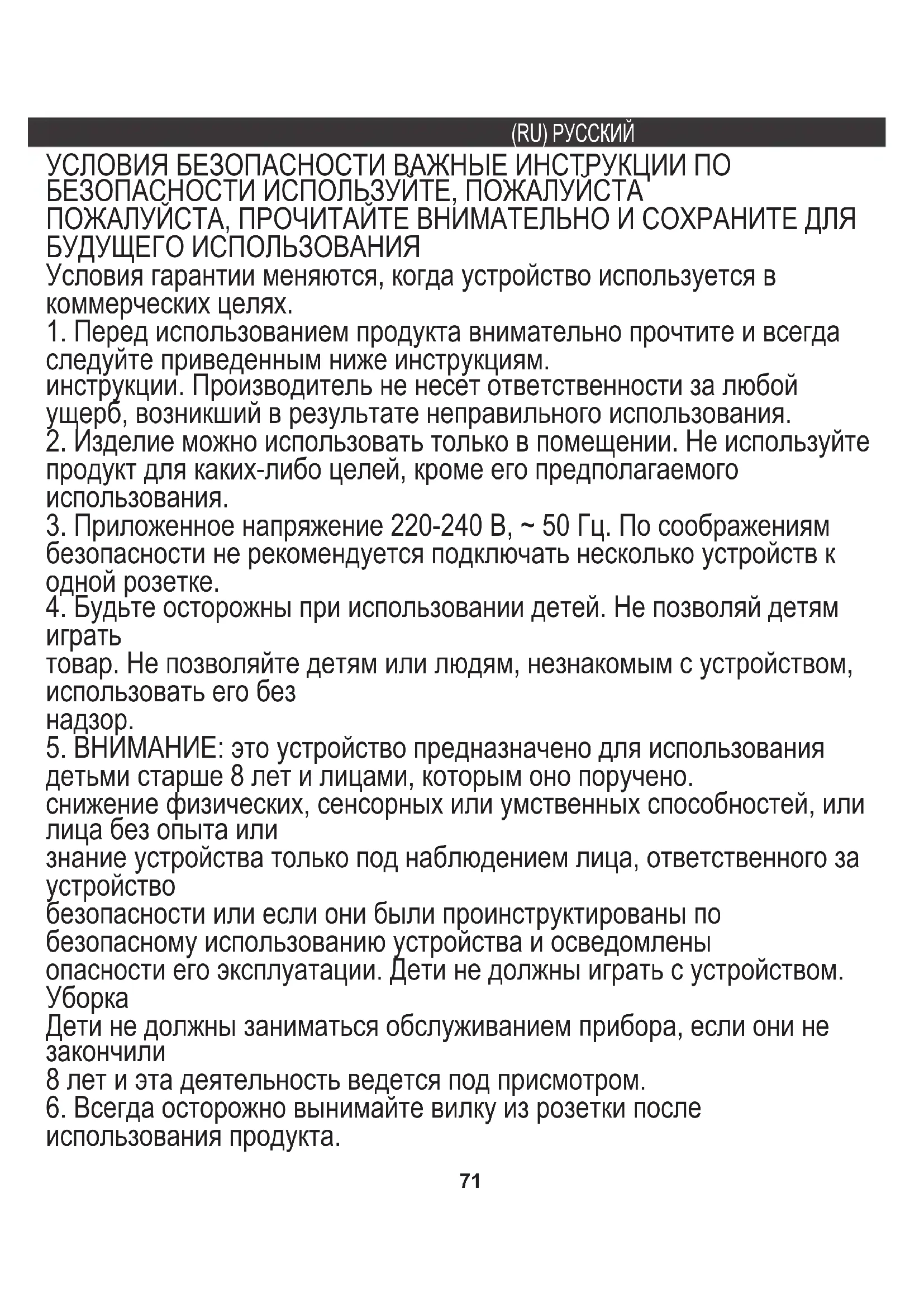 ПОЖАЛУЙСТА, ПРОЧИТАЙТЕ ВНИМАТЕЛЬНО И СОХРАНИТЕ ДЛЯ БУДУЩЕГО ИСПОЛЬЗОВАНИЯ Условия гарантии меняются, когда устройство используется в коммерческих целях. УСЛОВИЯ БЕЗОПАСНОСТИ ВАЖНЫЕ ИНСТРУКЦИИ ПО БЕЗОПАСНОСТИ ИСПОЛЬЗУЙТЕ, ПОЖАЛУЙСТА