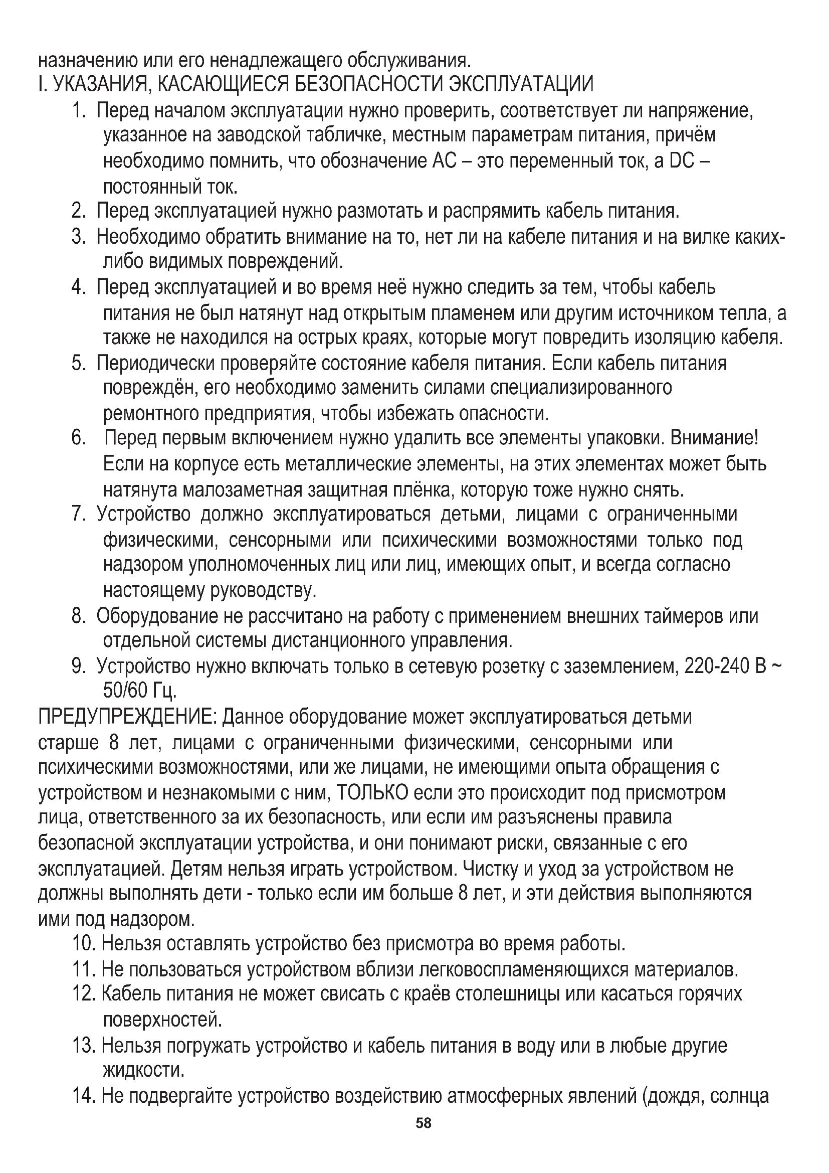 50/60 Гц. ПРЕДУПРЕЖДЕНИЕ: Данное оборудование может эксплуатироваться детьми старше 8 лет, лицами с ограниченными физическими, сенсорными или психическими возможностями, или же лицами, не имеющими опыта обращения с устройством и незнакомыми с ним, ТОЛЬКО если это происходит под присмотром лица, ответственного за их безопасность, или если им разъяснены правила безопасной эксплуатации устройства, и они понимают риски, связанные с его эксплуатацией. Детям нельзя играть устройством. Чистку и уход за устройством не должны выполнять дети - только если им больше 8 лет, и эти действия выполняются ими под надзором.