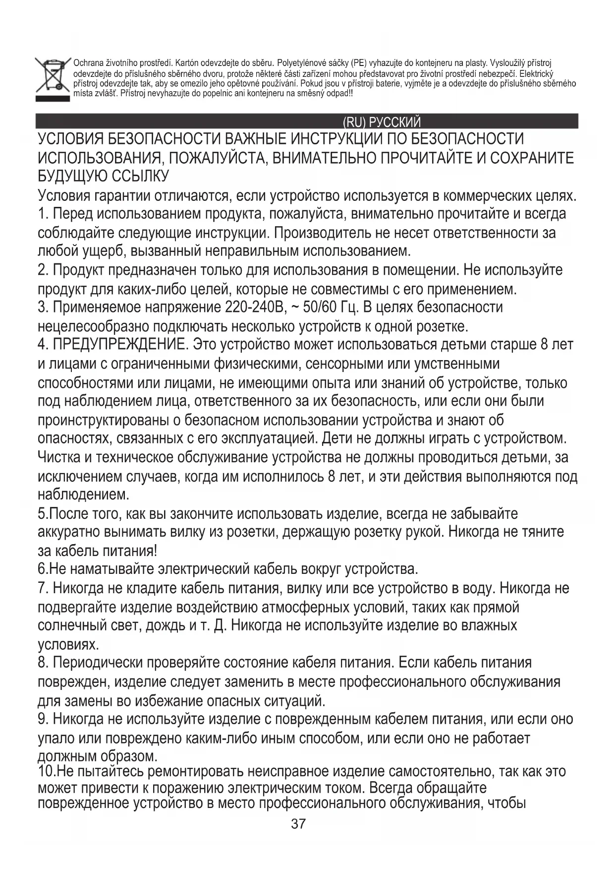 и лицами с ограниченными физическими, сенсорными или умственными способностями или лицами, не имеющими опыта или знаний об устройстве, только под наблюдением лица, ответственного за их безопасность, или если они были проинструктированы о безопасном использовании устройства и знают об опасностях, связанных с его эксплуатацией. Дети не должны играть с устройством. Чистка и техническое обслуживание устройства не должны проводиться детьми, за исключением случаев, когда им исполнилось 8 лет, и эти действия выполняются под наблюдением. 5.После того, как вы закончите использовать изделие, всегда не забывайте аккуратно вынимать вилку из розетки, держащую розетку рукой. Никогда не тяните за кабель питания! 6.Не наматывайте электрический кабель вокруг устройства.