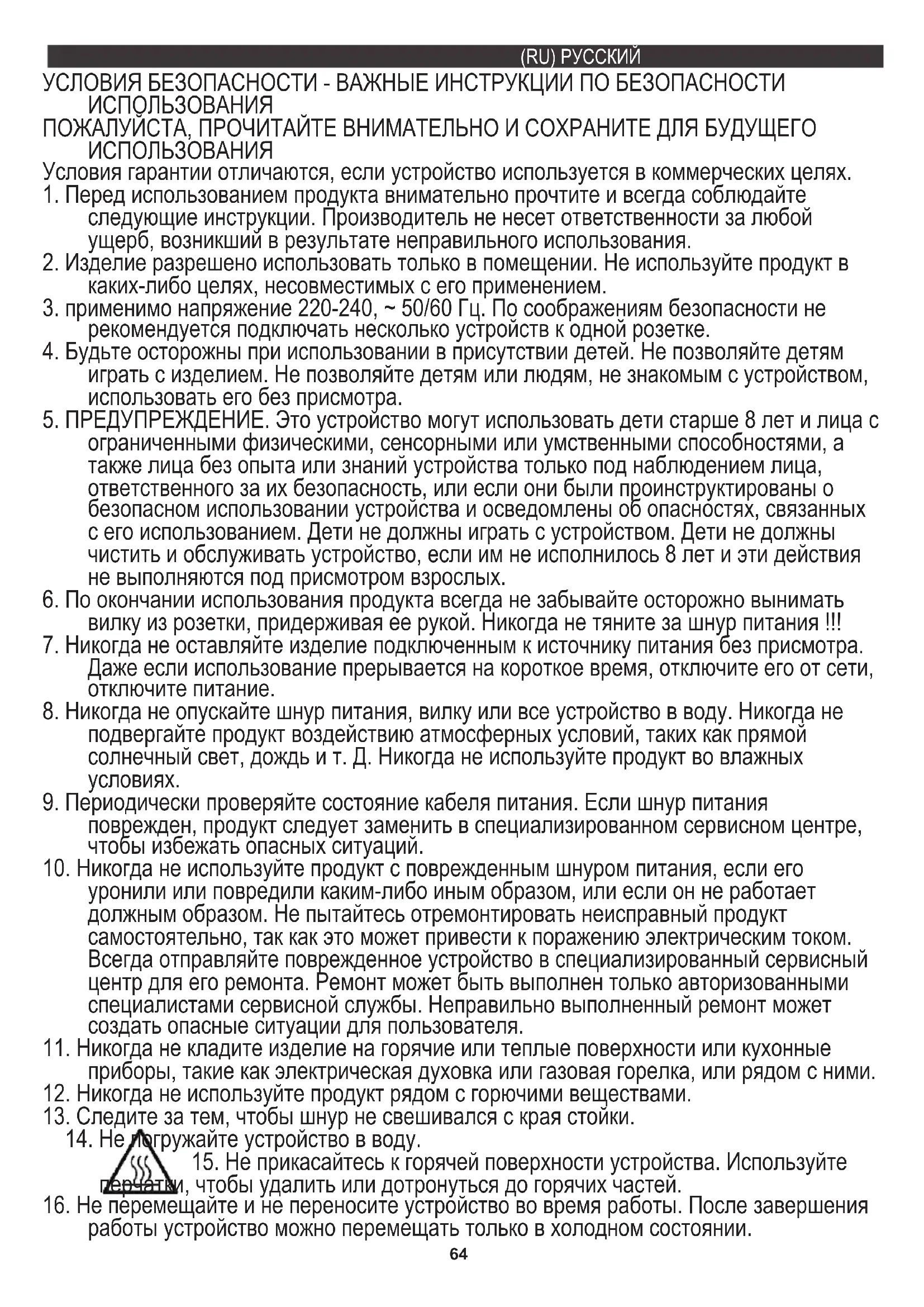 17. !! ВНИМАНИЕ !! Устройство испускает горячий пар под давлением. Есть высокая