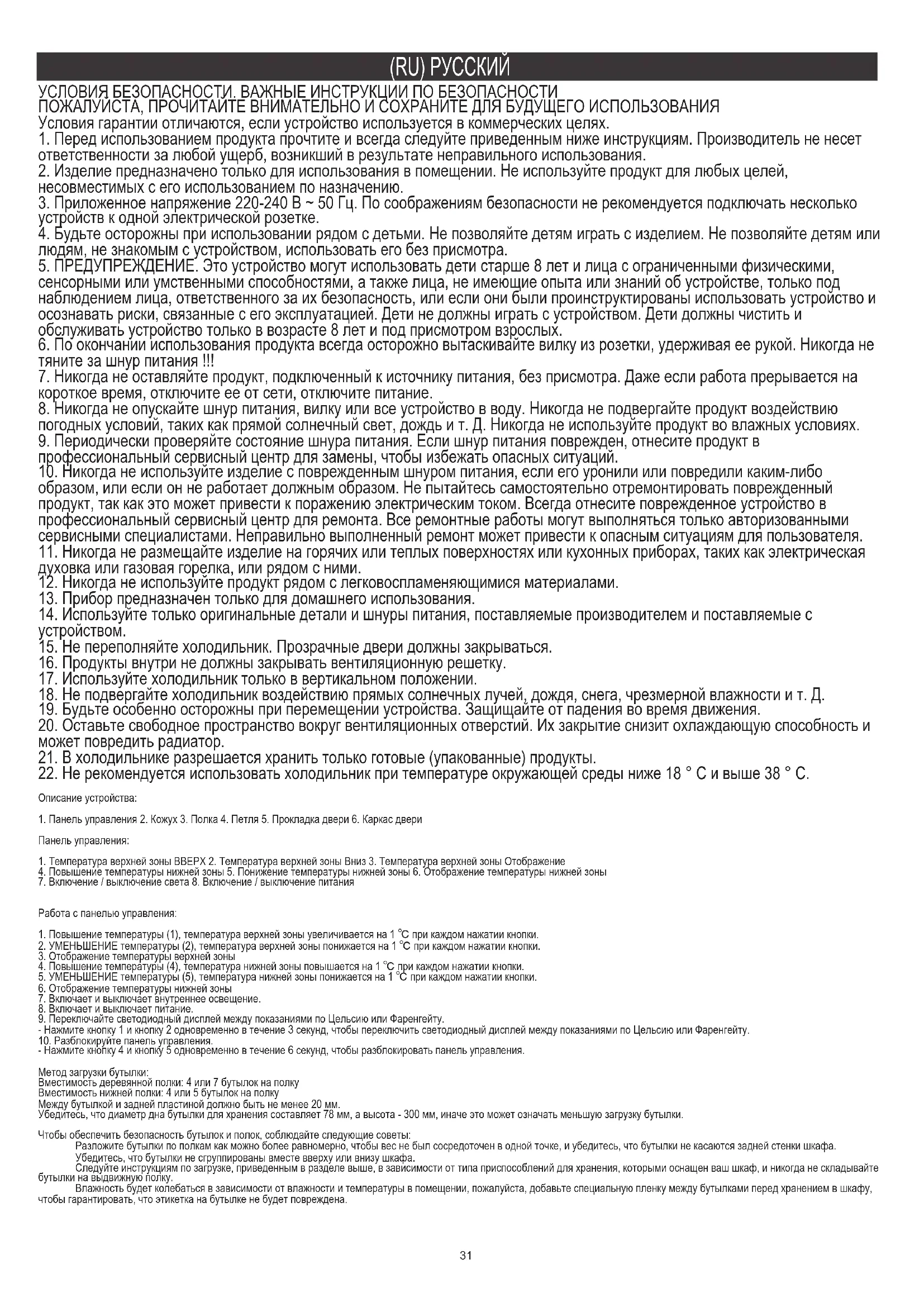 - Нажмите кнопку 4 и кнопку 5 одновременно в течение 6 секунд, чтобы разблокировать панель управления. Метод загрузки бутылки: Вместимость деревянной полки: 4 или 7 бутылок на полку Вместимость нижней полки: 4 или 5 бутылок на полку Между бутылкой и задней пластиной должно быть не менее 20 мм. Убедитесь, что диаметр дна бутылки для хранения составляет 78 мм, а высота - 300 мм, иначе это может означать меньшую загрузку бутылки. Чтобы обеспечить безопасность бутылок и полок, соблюдайте следующие советы: Разложите бутылки по полкам как можно более равномерно, чтобы вес не был сосредоточен в одной точке, и убедитесь, что бутылки не касаются задней стенки шкафа. Убедитесь, что бутылки не сгруппированы вместе вверху или внизу шкафа. Следуйте инструкциям по загрузке, приведенным в разделе выше, в зависимости от типа приспособлений для хранения, которыми оснащен ваш шкаф, и никогда не складывайте бутылки на выдвижную полку. Влажность будет колебаться в зависимости от влажности и температуры в помещении, пожалуйста, добавьте специальную пленку между бутылками перед хранением в шкафу, чтобы гарантировать, что этикетка на бутылке не будет повреждена. УСЛОВИЯ БЕЗОПАСНОСТИ. ВАЖНЫЕ ИНСТРУКЦИИ ПО БЕЗОПАСНОСТИ ПОЖАЛУЙСТА, ПРОЧИТАЙТЕ ВНИМАТЕЛЬНО И СОХРАНИТЕ ДЛЯ БУДУЩЕГО ИСПОЛЬЗОВАНИЯ Условия гарантии отличаются, если устройство используется в коммерческих целях.