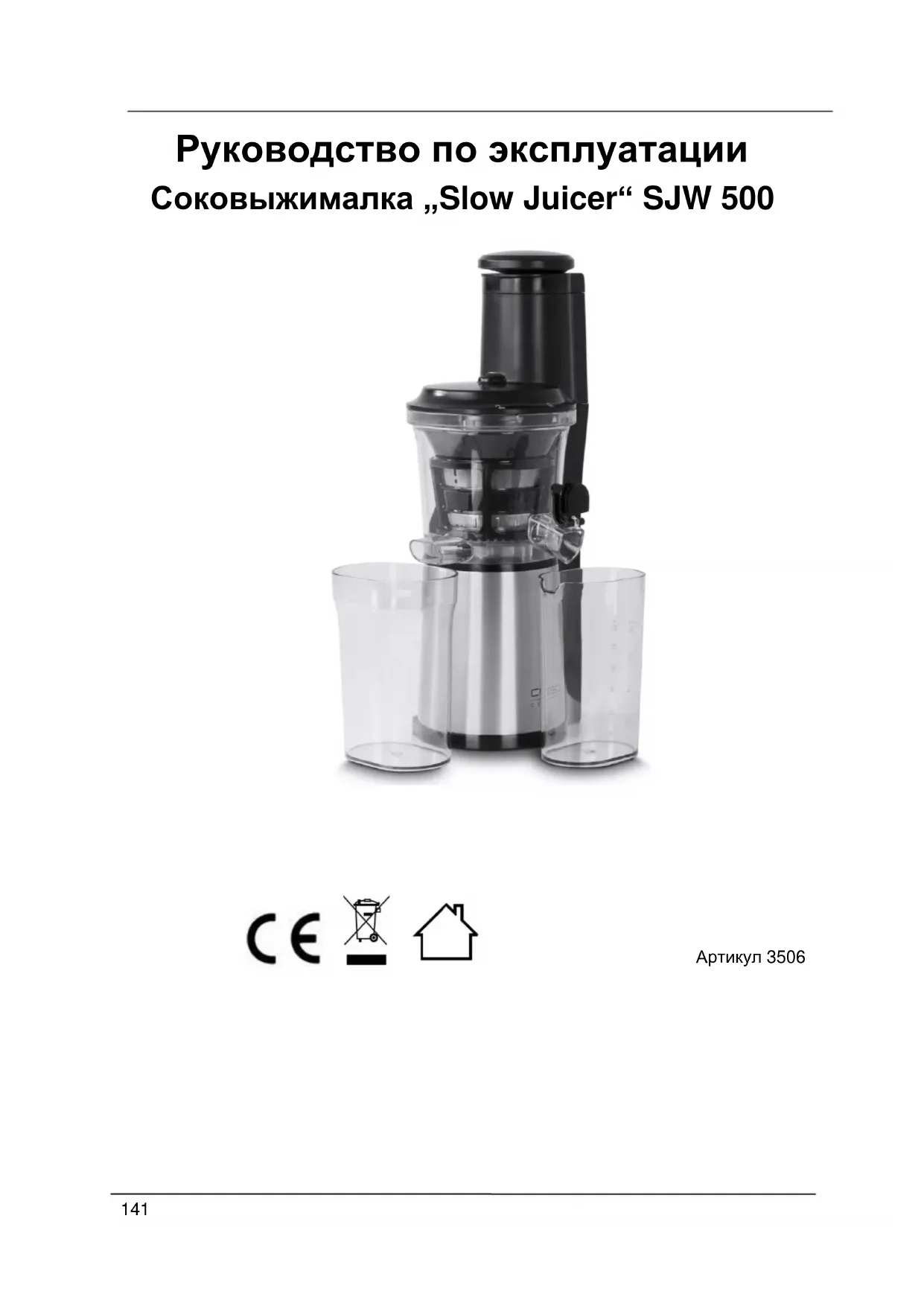 Пожалуйста, прочтите информацию, содержащуюся в данном Руководстве по эксплуатации, чтобы быстро ознакомиться с прибором и в полном объеме использовать все его функции. Ваша соковыжималка SJW 500 прослужит Вам долгие годы при надлежащем использовании и уходе. Желаем приятного пользования!