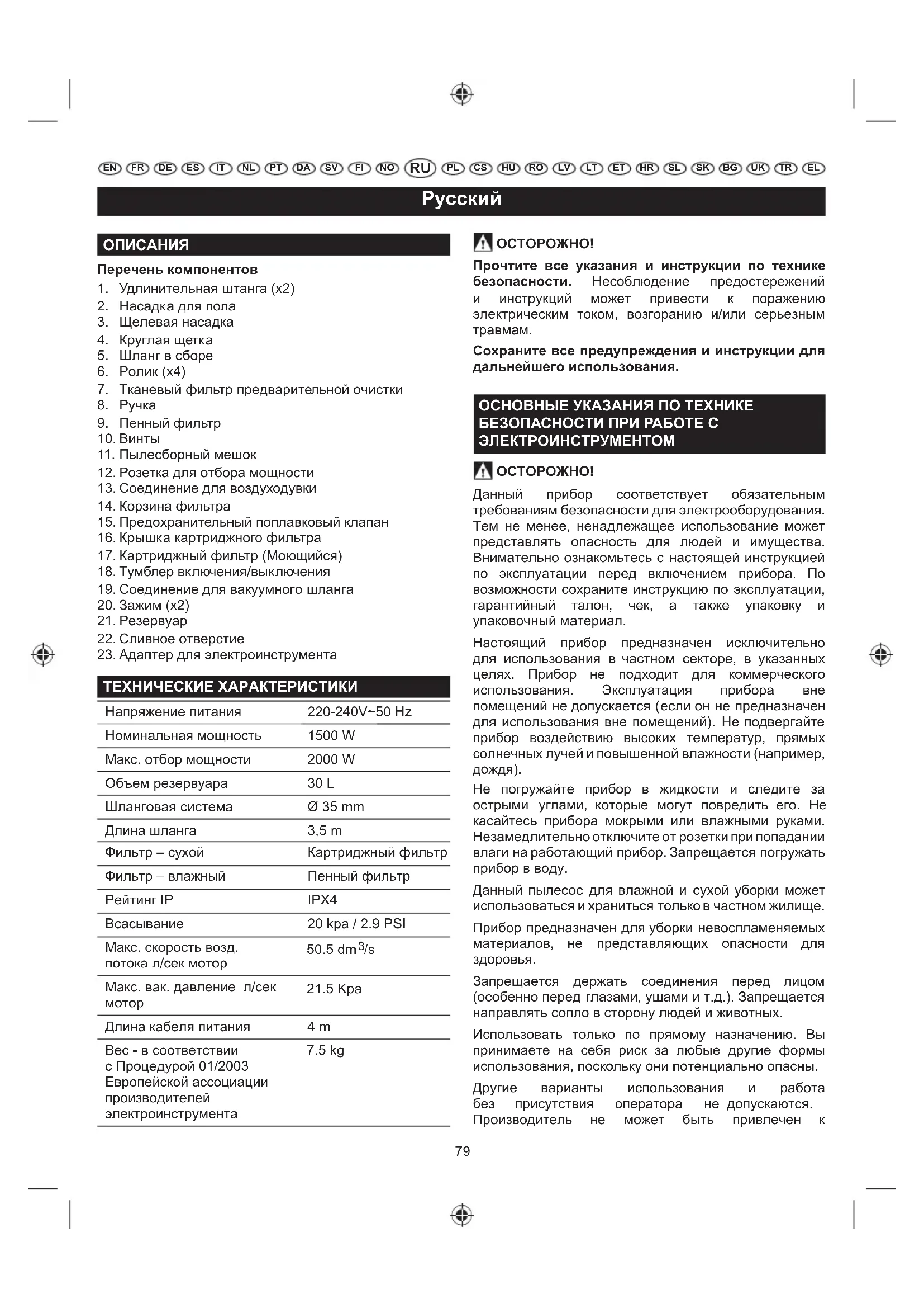 EN FR DE ES IT NL PT DA SV FI NO PL CS HU RO LV LT ET HR SL SK UKBG TR EL когда они были обучены пользованию устройством лицом, ответственным за их безопасность. Такие люди должны быть под наблюдением при использовании данного устройства. Дети не должны использовать, очищать это устройство или играть с ним. Оно должно храниться в недоступном для детей месте. Дети должны контролироваться, чтобы гарантировать, что они не играют с прибором. При повреждении кабеля электропитания, во избежание потенциального риска, его замену должен осуществлять производитель, сервисный агент или другое лицо соответствующей квалификации. Питание должно поступать через устройство дифференциальной защиты (RCD), отключающееся при силе тока свыше 30 мА. Допускается использование только влагонепроницаемого удлинительного шнура. Перед каждым использованием проверяйте удлинительный шнур на предмет повреждений. Всегда раскручивайте удлинительный шнур в процессе использования, поскольку скрученные шнуры могут перегреваться. Поврежденный удлинительный шнур ремонту не подлежит. Его необходимо заменить на аналогичный. ПРИ ИСПОЛЬЗОВАНИИ ФУНКЦИИ ВОЗДУХОДУВКИ: Поток воздуха направлять только на рабочую зону, и никогда - на людей и животных. Использование воздуходувки в качестве распылителя в режиме влажной уборки не допускается. Используйте пылезащитную маску и защитные очки.