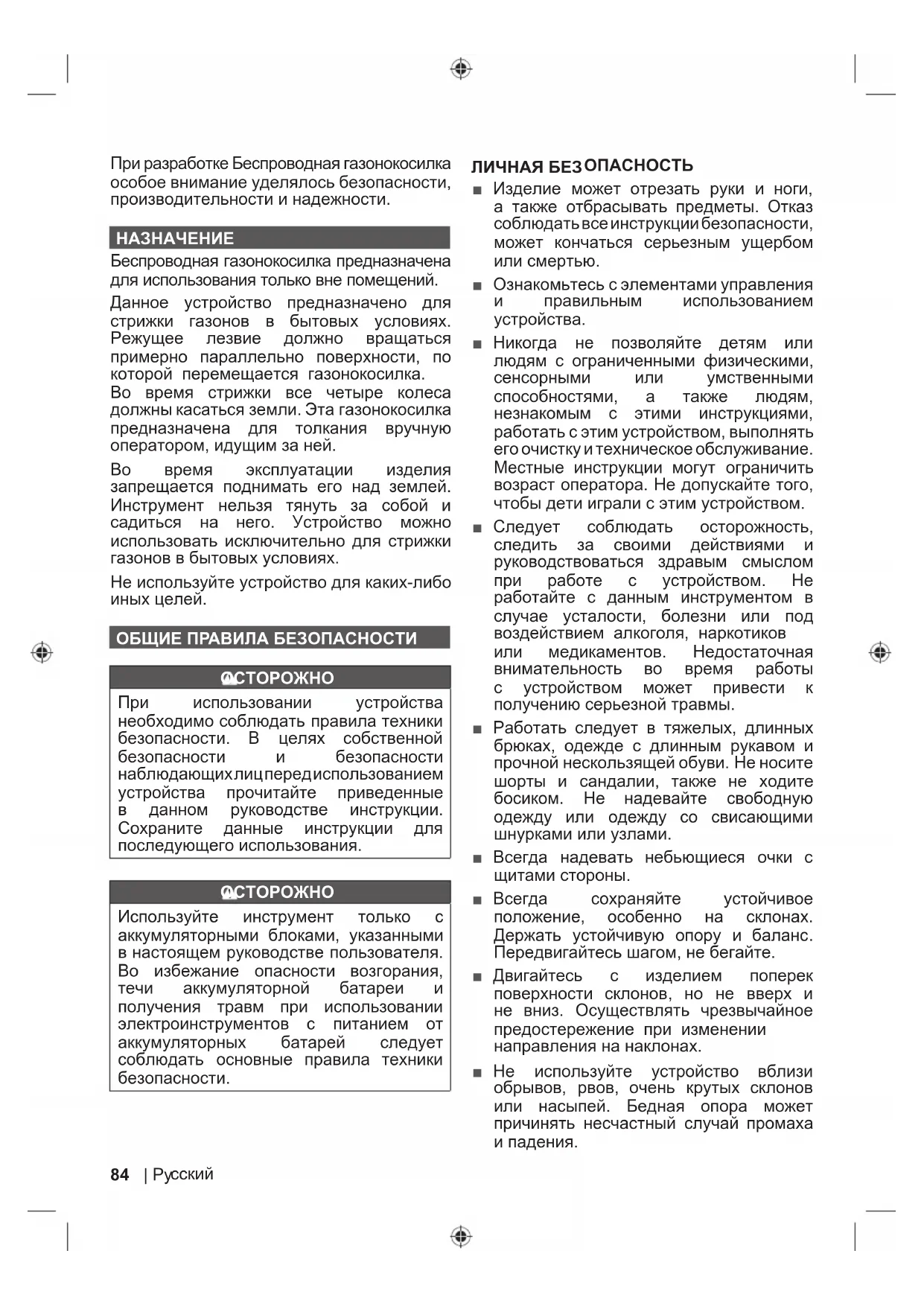■ Не сжигайте аккумуляторную батарею. ■ При ненормальных условиях из батареи может вытечь жидкость, избегайте контакта с ней. Если этого избежать не удалось, смойте жидкость водой. Если жидкость попала в глаза, после их промывания обратитесь за медицинской помощью. Жидкость, вытекшая из батареи, может вызвать раздражение или ожог. ПРЕДОСТЕРЕЖЕНИЯ ОТНОСИТЕЛЬНО БЕЗОПАСНОГО ПОЛЬЗОВАНИЯ ГАЗОНОКОСИЛКИ ■ Перед работой всегда проверяйте инструмент на наличие износа или повреждений режущего лезвия, болтов для его крепления полотна и режущего