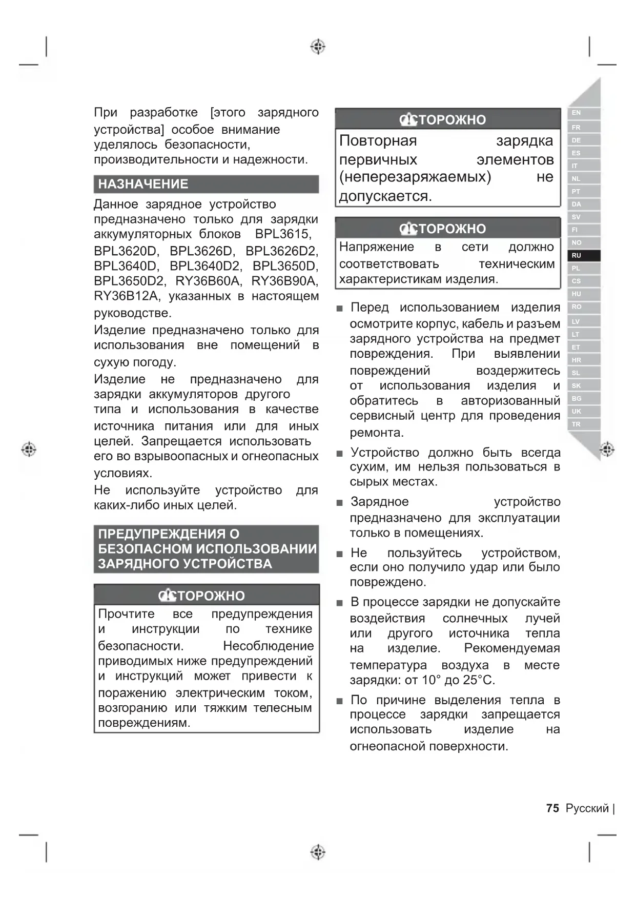 Данное зарядное устройство предназначено только для зарядки аккумуляторных блоков BPL3615, BPL3620D, BPL3626D, BPL3626D2, BPL3640D, BPL3640D2, BPL3650D, BPL3650D2, RY36B60A, RY36B90A, RY36B12A, указанных в настоящем руководстве. Изделие предназначено только для использования вне помещений в сухую погоду. Изделие не предназначено для зарядки аккумуляторов другого типа и использования в качестве источника питания или для иных целей. Запрещается использовать его во взрывоопасных и огнеопасных