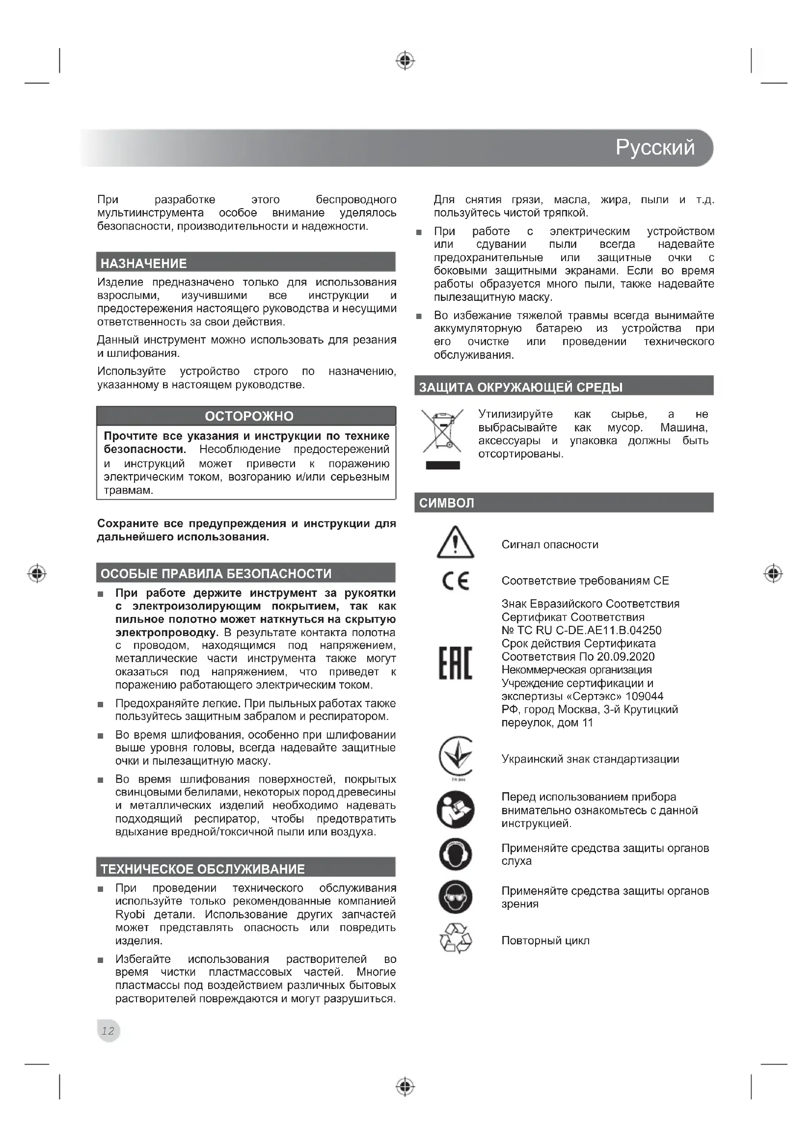 ЗАЯВЛЕНИЕ О СООТВЕТСТВИИ ТРЕБОВАНИЯМ EC Techtronic Industries GmbHMax-Eyth-Straße 10, 71364 Winnenden, GermanyНастоящим мы заявляем, что данный продуктМногофункциональный Инструмент 18 В One+Марка: RyobiНомер модели: RMT1801Диапазон заводских номеров: 44405302000001 - 44405302999999соответствует требованиям следующих Директив ЕС и согласованных стандартов2006/42/EC, 2004/108/EC (до 19 апреля 2016), 2014/30/EU (c 20 апреля 2016), 2011/65/EU,EN 60745-1:2009+A11:2010, EN 60745-2-4:2009+A11:2011,EN 55014-1:2006+A1:2009+A2:2011, EN 55014-2:1997+A1:2001+A2:2008Документация RoHS соответствует стандарту EN 50581:2012