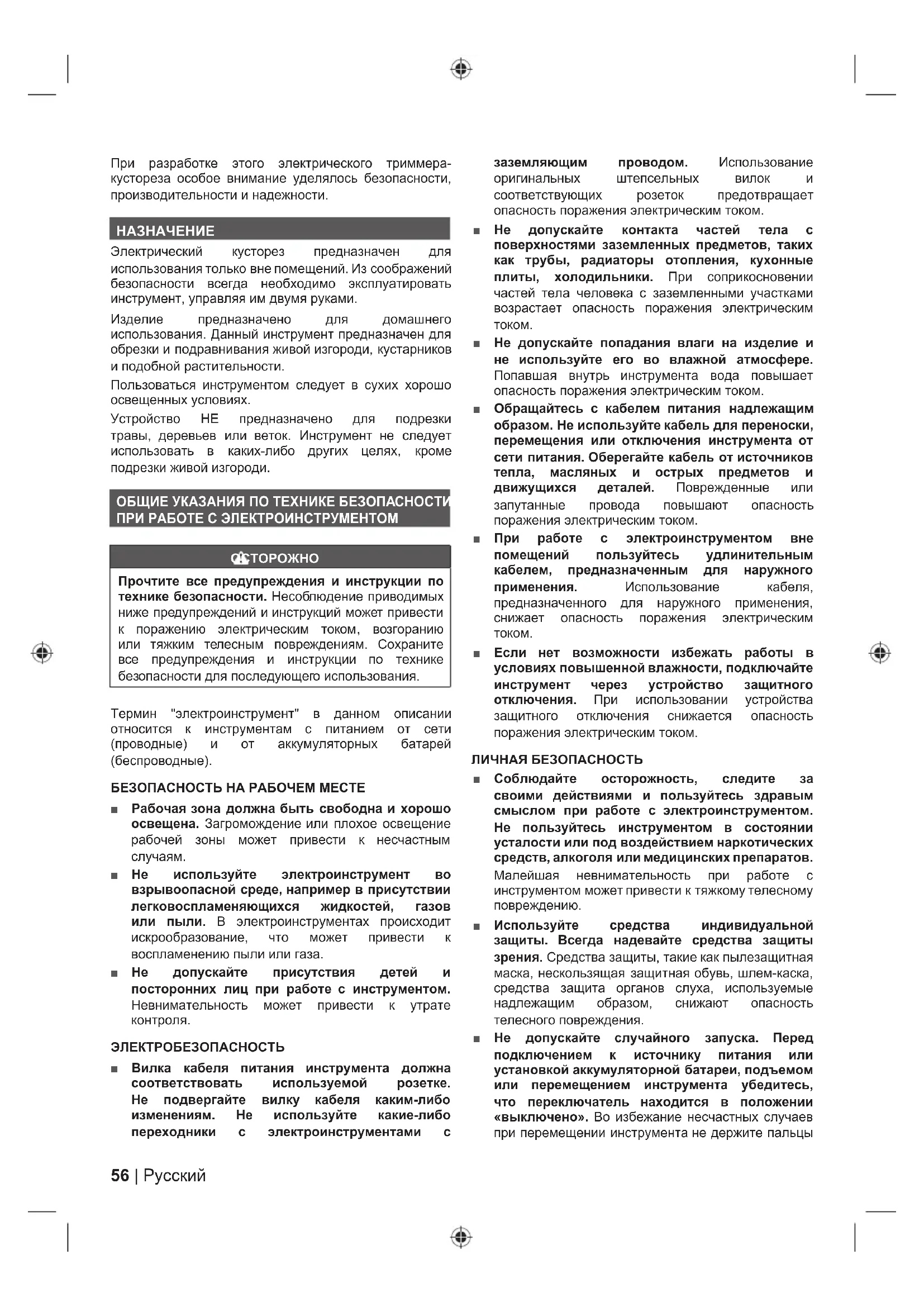 Электрический кусторез предназначен для использования только вне помещений. Из соображений безопасности всегда необходимо эксплуатировать инструмент, управляя им двумя руками. Изделие предназначено для домашнего использования. Данный инструмент предназначен для обрезки и подравнивания живой изгороди, кустарников и подобной растительности. Пользоваться инструментом следует в сухих хорошо освещенных условиях. Устройство НЕ предназначено для подрезки травы, деревьев или веток. Инструмент не следует использовать в каких-либо других целях, кроме подрезки живой изгороди. ОБЩИЕ УКАЗАНИЯ ПО ТЕХНИКЕ БЕЗОПАСНОСТИ ПРИ РАБОТЕ С ЭЛЕКТРОИНСТРУМЕНТОМ