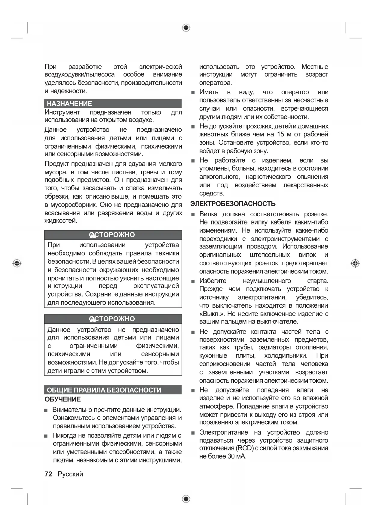 Инструмент предназначен только для использования на открытом воздухе. Данное устройство не предназначено для использования детьми или лицами с ограниченными физическими, психическими или сенсорными возможностями. Продукт предназначен для сдувания мелкого мусора, в том числе листьев, травы и тому подобных предметов. Он предназначен для того, чтобы засасывать и слегка измельчать обрезки, как описано выше, и помещать это в мусоросборник. Оно не предназначено для всасывания или разряжения воды и других