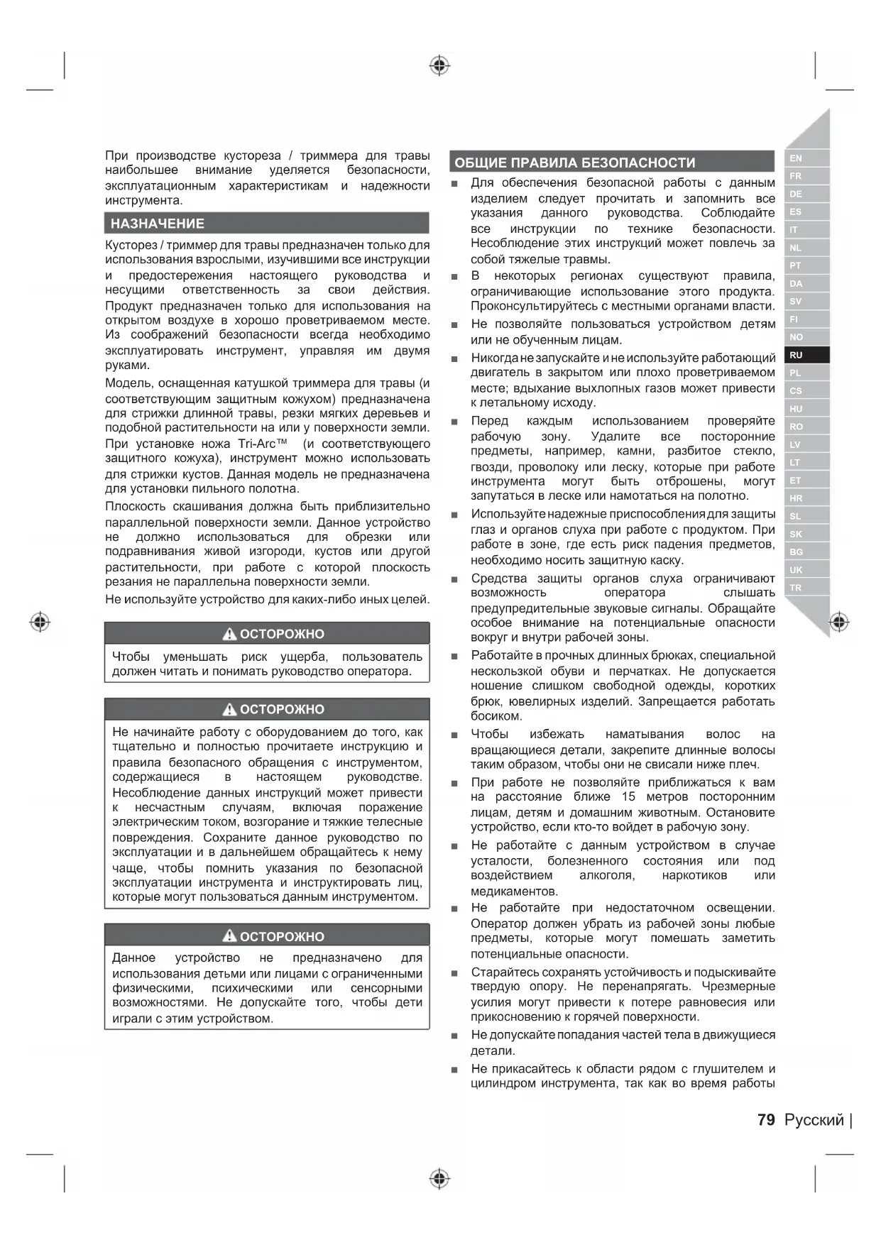 Данное устройство не предназначено для использования детьми или лицами с ограниченными физическими, психическими или сенсорными возможностями. Не допускайте того, чтобы дети играли с этим устройством. ОБЩИЕ ПРАВИЛА БЕЗОПАСНОСТИ ■ Для обеспечения безопасной работы с данным изделием следует прочитать и запомнить все указания данного руководства. Соблюдайте все инструкции по технике безопасности. Несоблюдение этих инструкций может повлечь за собой тяжелые травмы. ■ В некоторых регионах существуют правила, ограничивающие использование этого продукта. Проконсультируйтесь с местными органами власти. ■ Не позволяйте пользоваться устройством детям или не обученным лицам. ■ Никогда не запускайте и не используйте работающий двигатель в закрытом или плохо проветриваемом месте; вдыхание выхлопных газов может привести к летальному исходу. ■ Перед каждым использованием проверяйте рабочую зону. Удалите все посторонние предметы, например, камни, разбитое стекло, гвозди, проволоку или леску, которые при работе инструмента могут быть отброшены, могут запутаться в леске или намотаться на полотно. ■ Используйте надежные приспособления для защиты глаз и органов слуха при работе с продуктом. При работе в зоне, где есть риск падения предметов, необходимо носить защитную каску. ■ Средства защиты органов слуха ограничивают возможность оператора слышать предупредительные звуковые сигналы. Обращайте особое внимание на потенциальные опасности вокруг и внутри рабочей зоны. ■ Работайте в прочных длинных брюках, специальной нескользкой обуви и перчатках. Не допускается ношение слишком свободной одежды, коротких брюк, ювелирных изделий. Запрещается работать
