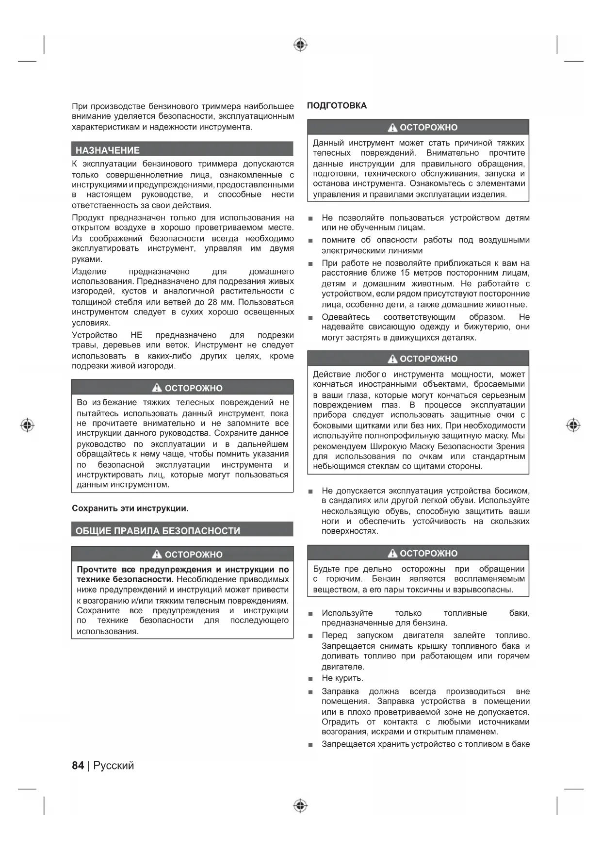 К эксплуатации бензинового триммера допускаются только совершеннолетние лица, ознакомленные с инструкциями и предупреждениями, предоставленными в настоящем руководстве, и способные нести ответственность за свои действия. Продукт предназначен только для использования на открытом воздухе в хорошо проветриваемом месте. Из соображений безопасности всегда необходимо эксплуатировать инструмент, управляя им двумя