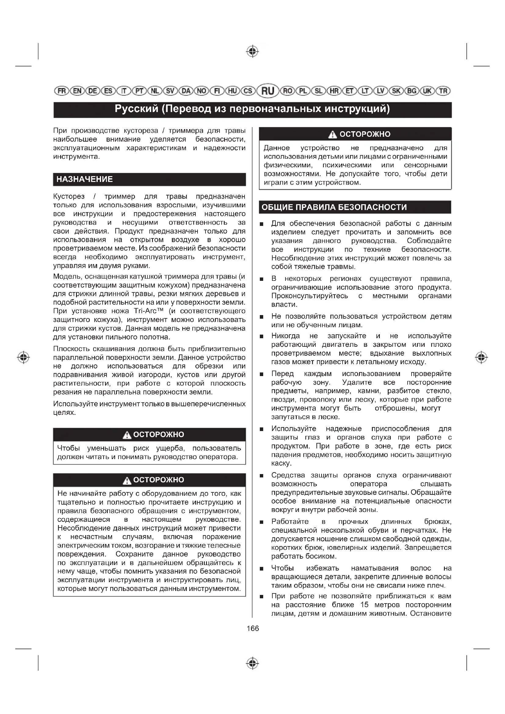 Кусторез / триммер для травы предназначен только для использования взрослыми, изучившими все инструкции и предостережения настоящего руководства и несущими ответственность за свои действия. Продукт предназначен только для использования на открытом воздухе в хорошо проветриваемом месте. Из соображений безопасности всегда необходимо эксплуатировать инструмент, управляя им двумя руками. Модель, оснащенная катушкой триммера для травы