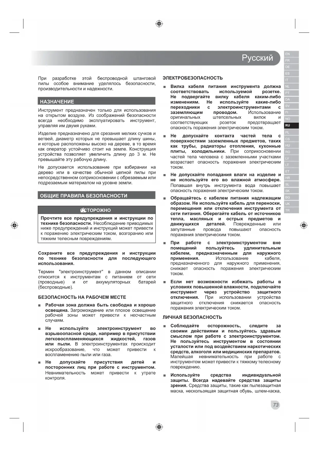 Инструмент предназначен только для использования на открытом воздухе. Из соображений безопасности всегда необходимо эксплуатировать инструмент, управляя им двумя руками. Изделие предназначено для срезания мелких сучков и ветвей, диаметр которых не превышает длину шины, и которые расположены высоко на дереве, в то время как оператор устойчиво стоит на земле. Конструкция устройства позволяет увеличить длину до 3 м. Не превышайте эту рабочую длину. Не допускается использование при взбирании на дерево или в качестве обычной цепной пилы при непосредственном соприкосновении с обрезаемым или подрезаемым материалом на уровне земли. ОБЩИЕ ПРАВИЛА БЕЗОПАСНОСТИ