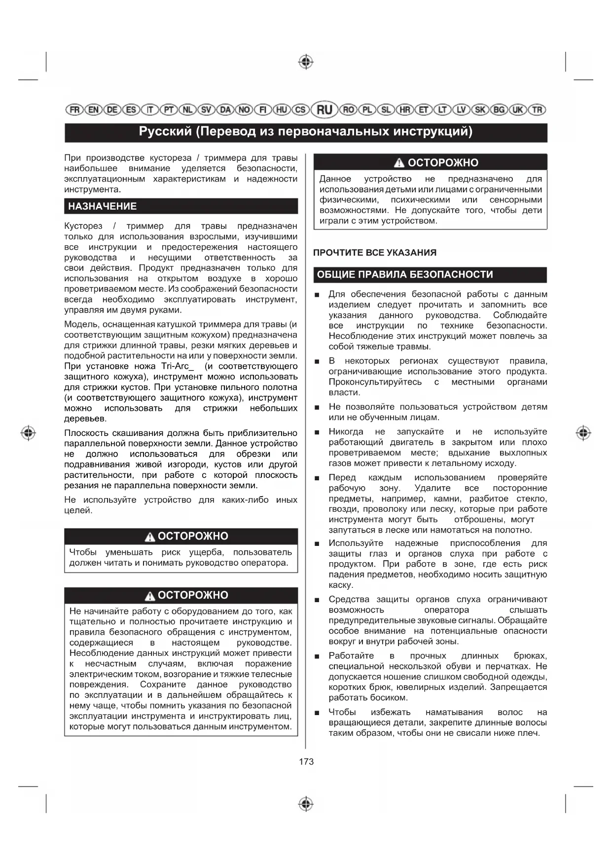 ■ Средства защиты органов слуха ограничивают возможность оператора слышать предупредительные звуковые сигналы. Обращайте особое внимание на потенциальные опасности вокруг и внутри рабочей зоны. ■ Работайте в прочных длинных брюках, специальной нескользкой обуви и перчатках. Не допускается ношение слишком свободной одежды, коротких брюк, ювелирных изделий. Запрещается работать босиком. ■ Чтобы избежать наматывания волос на вращающиеся детали, закрепите длинные волосы таким образом, чтобы они не свисали ниже плеч.174 Русский (Перевод из первоначальных инструкций) ■ При работе не позволяйте приближаться к вам на расстояние ближе 15 метров посторонним лицам, детям и домашним животным. Остановите устройство, если кто-то войдет в рабочую зону. ■Не работайте с данным устройством в случае усталости, болезненного состояния или под воздействием алкоголя, наркотиков или медикаментов. ■Не работайте при недостаточном освещении.