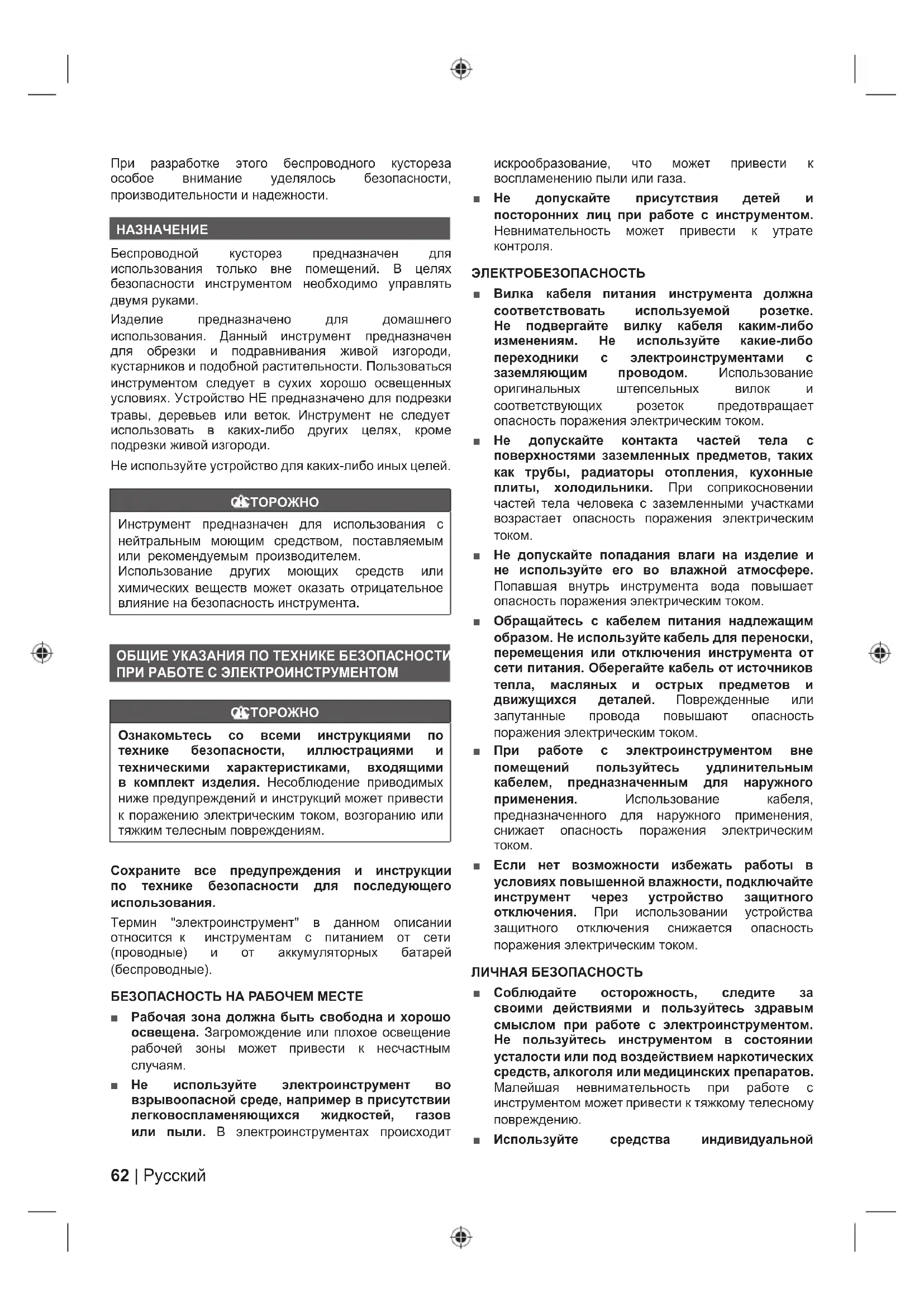 При заклинивании изделия отпустите оба курка, очистите лезвия от застрявшего материала, подождите 2 секунды, затем возобновите работу. ДОПОЛНИТЕЛЬНЫЕ УКАЗАНИЯ ПО БЕЗОПАСНОСТИ ■ В некоторых регионах существуют правила, ограничивающие использование этого продукта. Проконсультируйтесь с местными органами власти. Прочтите все указания ■ Перед каждым использованием проверяйте рабочую зону. Уберите такие объекты, как провода или шнуры, которые могут отлетать или запутываться в режущих принадлежностях. ■ Убедитесь, что в кустарнике нет посторонних предметов, таких как проволочные ограждения. ■ Необходимо соблюдать особую осторожность при использовании изделия вблизи ограждений, постов, зданий и других неподвижных объектов. ■ Остерегайтесь отлетающих предметов. Не допускайте прохожих, детей и домашних животных ближе чем на 15 м от рабочей зоны. Остановите устройство, если кто-то войдет в рабочую зону. ■ Не позволяйте пользоваться устройством детям или не обученным лицам. ■ Использование изделия в условиях слабого освещения не допускается. Оператор должен четко видеть рабочую зону в целях выявления потенциальных опасностей. ■ Перед использованием устройства установите все ручки и защитные устройства. Использование некомплектного изделия или модифицированного изделия не допускается. ■ Убедитесь перед каждым использованием, что все элементы управления и предохранительные устройства функционируют правильно. Не используйте устройство, если невозможно остановить двигатель выключателем. ■ Проверяйте устройство перед каждым использованием. Проверьте надежность креплений, убедитесь, что все защитные приспособления и ручки правильно и надежно закреплены. Перед использованием замените поврежденные детали. Проверьте аккумуляторную батарею на отсутствие