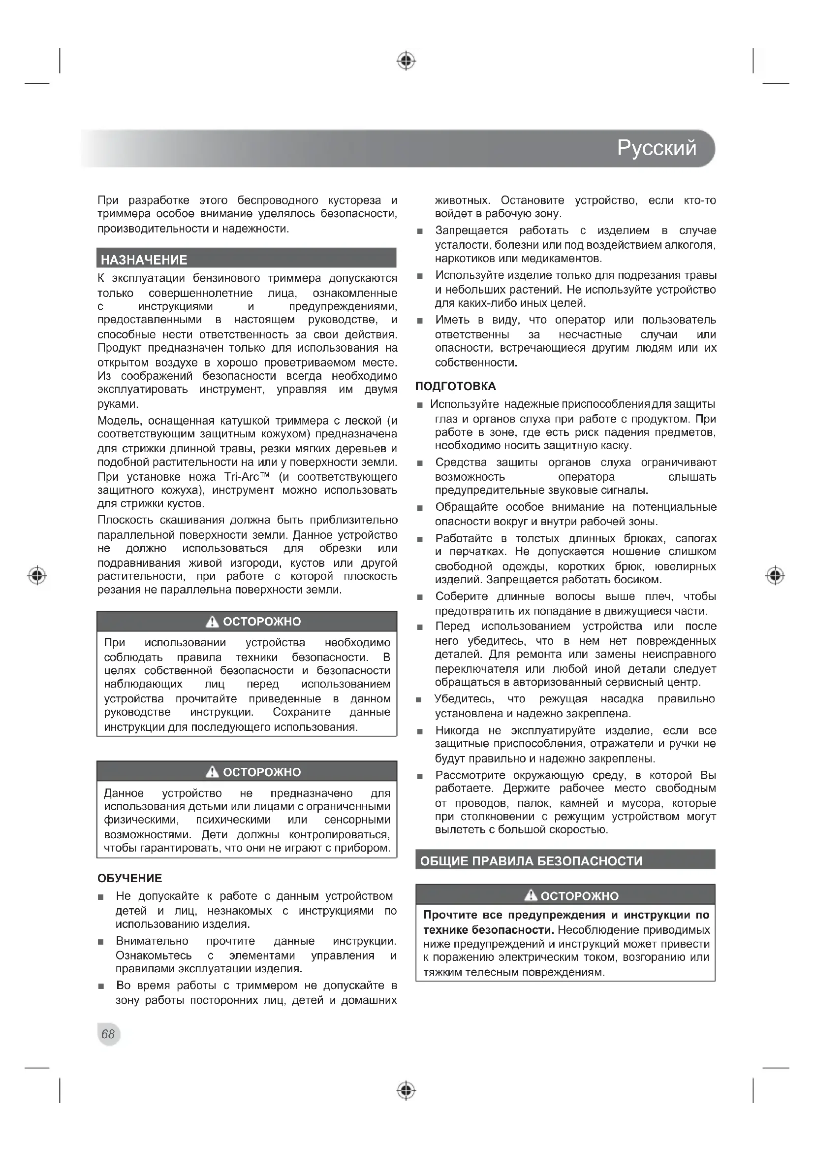 Носите устройства защиты слуха и ограничивайте продолжительность шумового воздействия. – Травмы, вызываемые отлетающим мусором Обязательно носите устройства для защиты глаз. Контакт с режущими приспособлениями. Убедитесь, что режущие приспособления закрыты крышками, когда изделие не используется. Не допускайте попадания рук и ног в зону работы режущих приспособлений.Русский