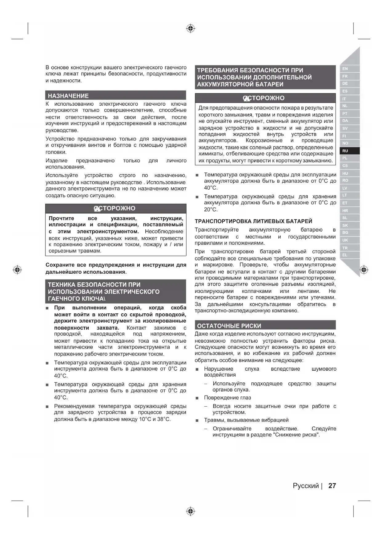 Прочтите все указания, инструкции, иллюстрации и спецификации, поставляемый с этим электроинструментом. Несоблюдение всех инструкций, указанных ниже, может привести к поражению электрическим током, пожару и / или серьезным травмам. Сохраните все предупреждения и инструкции для дальнейшего использования. ТЕХНИКА БЕЗОПАСНОСТИ ПРИ ИСПОЛЬЗОВАНИИ ЭЛЕКТРИЧЕСКОГО ГАЕЧНОГО КЛЮЧА\ ■ При выполнении операций, когда скоба может войти в контакт со скрытой проводкой, держите электроинструмент за изолированные поверхности захвата. Контакт зажимов с проводкой, находящейся под напряжением, может привести к попаданию тока на открытые металлические части электроинструмента и к поражению рабочего электрическим током. ■ Температура окружающей среды для эксплуатации инструмента должна быть в диапазоне от 0°C до 40°C. ■ Температура окружающей среды для хранения инструмента должна быть в диапазоне от 0°C до 40°C. ■ Рекомендуемая температура окружающей среды для зарядного устройства в процессе зарядки должна быть в диапазоне между 10°C и 38°C. ТРЕБОВАНИЯ БЕЗОПАСНОСТИ ПРИ ИСПОЛЬЗОВАНИИ ДОПОЛНИТЕЛЬНОЙ АККУМУЛЯТОРНОЙ БАТАРЕИ