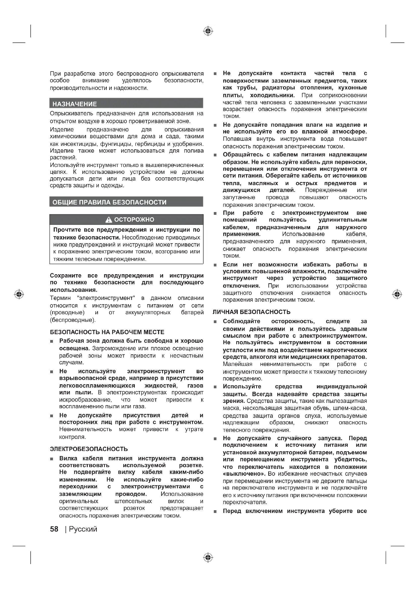 Advarsel58 | Русский При разработке этого беспроводного опрыскивателя особое внимание уделялось безопасности, производительности и надежности.