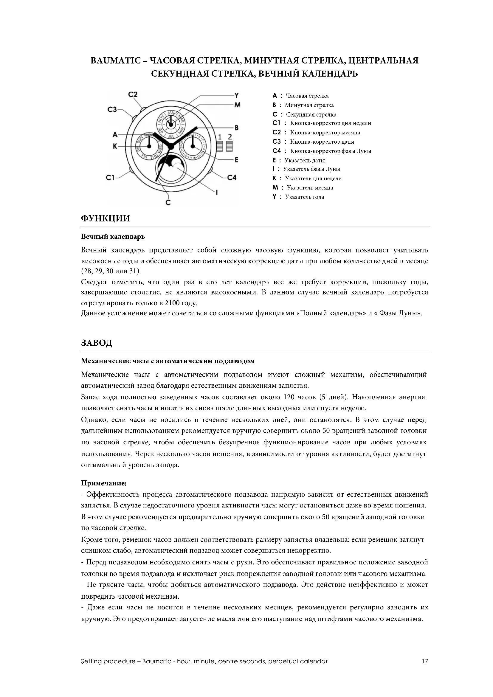 Механические часы с автоматическим подзаводом Механические часы с автоматическим подзаводом имеют сложный механизм, обеспечивающий автоматический завод благодаря естественным движениям запястья. Запас хода полностью заведенных часов составляет около 120 часов (5 дней). Накопленная энергия позволяет снять часы и носить их снова после длинных выходных или спустя неделю. Однако, если часы не носились в течение нескольких дней, они остановятся. В этом случае перед дальнейшим использованием рекомендуется вручную совершить около 50 вращений заводной головки по часовой стрелке, чтобы обеспечить безупречное функционирование часов при любых условиях использования. Через несколько часов ношения, в зависимости от уровня активности, будет достигнут оптимальный уровень завода. Примечание: - Эффективность процесса автоматического подзавода напрямую зависит от естественных движений запястья. В случае недостаточного уровня активности часы могут остановиться даже во время ношения. В этом случае рекомендуется предварительно вручную совершить около 50 вращений заводной головки по часовой стрелке. Кроме того, ремешок часов должен соответствовать размеру запястья владельца: если ремешок затянут слишком слабо, автоматический подзавод может совершаться некорректно. - Перед подзаводом необходимо снять часы с руки. Это обеспечивает правильное положение заводной головки во время подзавода и исключает риск повреждения заводной головки или часового механизма. - Не трясите часы, чтобы добиться автоматического подзавода. Это действие неэффективно и может повредить часовой механизм. - Даже если часы не носятся в течение нескольких месяцев, рекомендуется регулярно заводить их вручную. Это предотвращает загустение масла или его выступание над штифтами часового механизма.Setting procedure – Baumatic - hour, minute, centre seconds, perpetual calendar 18 УСТАНОВКА ВРЕМЕНИ Внимание: Чтобы не заблокировать кнопки корректора и не повредить тем самым механизм, запрещается выполнять какую-либо регулировку (дня недели, даты, месяца, фазы Луны) между 20:00 и 1:00. В футляре для часов Вы найдете пушер–корректор, при помощи которого можно производить коррекцию показаний. Для установки часов убедитесь, что они полностью заведены, и выполните следующие шаги в указанном порядке: Предварительный этап перед установкой