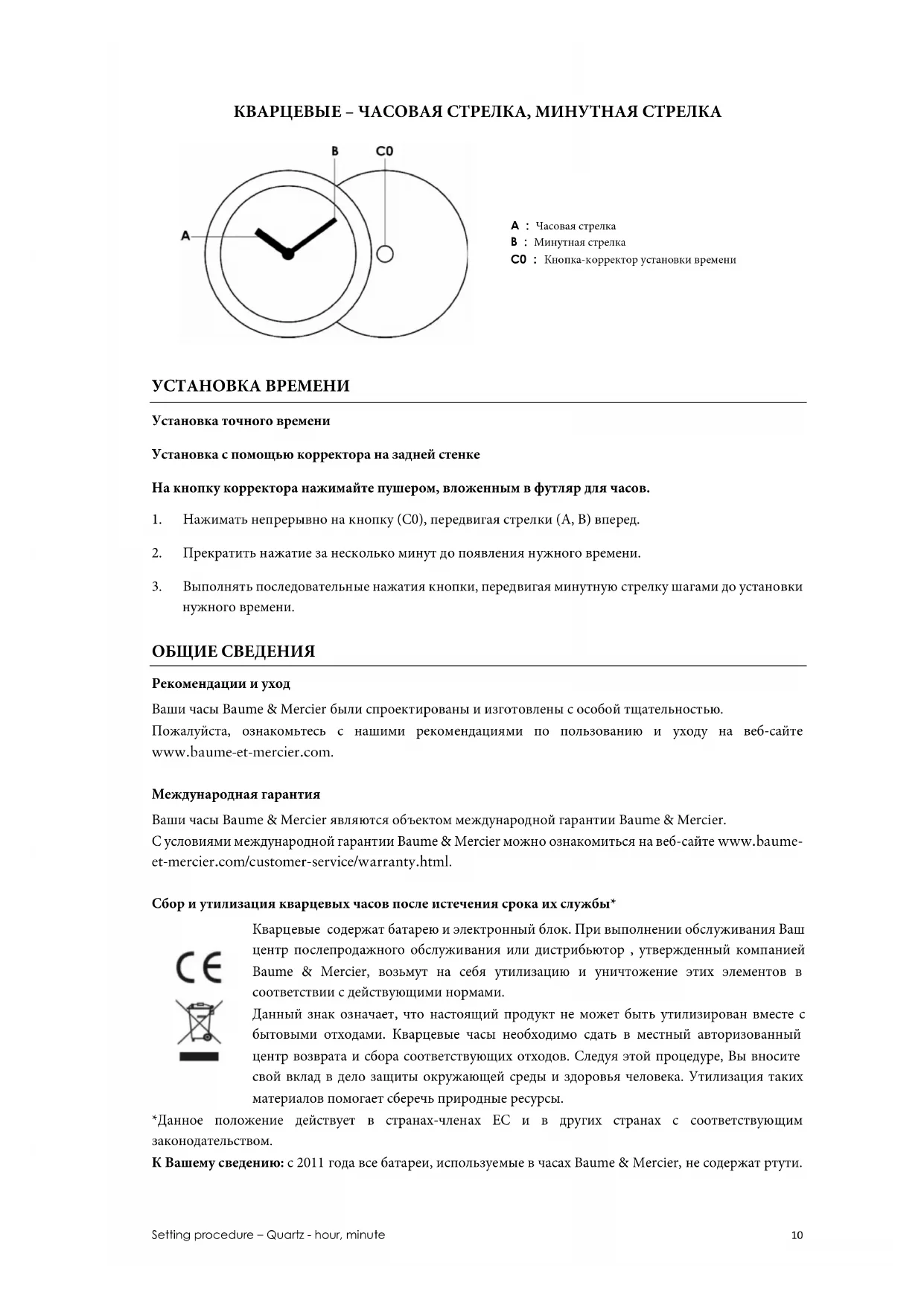 Кварцевые содержат батарею и электронный блок. При выполнении обслуживания Ваш центр послепродажного обслуживания или дистрибьютор , утвержденный компанией Baume & Mercier, возьмут на себя утилизацию и уничтожение этих элементов в соответствии с действующими нормами. Данный знак означает, что настоящий продукт не может быть утилизирован вместе с бытовыми отходами. Кварцевые часы необходимо сдать в местный авторизованный центр возврата и сбора соответствующих отходов. Следуя этой процедуре, Вы вносите свой вклад в дело защиты окружающей среды и здоровья человека. Утилизация таких материалов помогает сберечь природные ресурсы. *Данное положение действует в странах-членах ЕС и в других странах с соответствующим законодательством. К Вашему сведению: с 2011 года все батареи, используемые в часах Baume & Mercier, не содержат ртути.Setting procedure – Quartz - hour, minute 11 Другая информация Если у Вас возникли вопросы, приглашаем Вас посетить наш веб-сайт www.baume-et-mercier.com. Со всеми вопросами Вы можете обратиться к нашим официальным дистрибьюторам в своей стране (список имеется на нашем веб-сайте www.baume-et-mercier.com) или непосредственно к нам через веб- сайт, используя форму для обращений, или позвонив в наш Центр по обслуживанию клиентов (www.baume-et-mercier.com/customer-service/contact-us.html).Setting procedure – Quartz - hour, minute 12