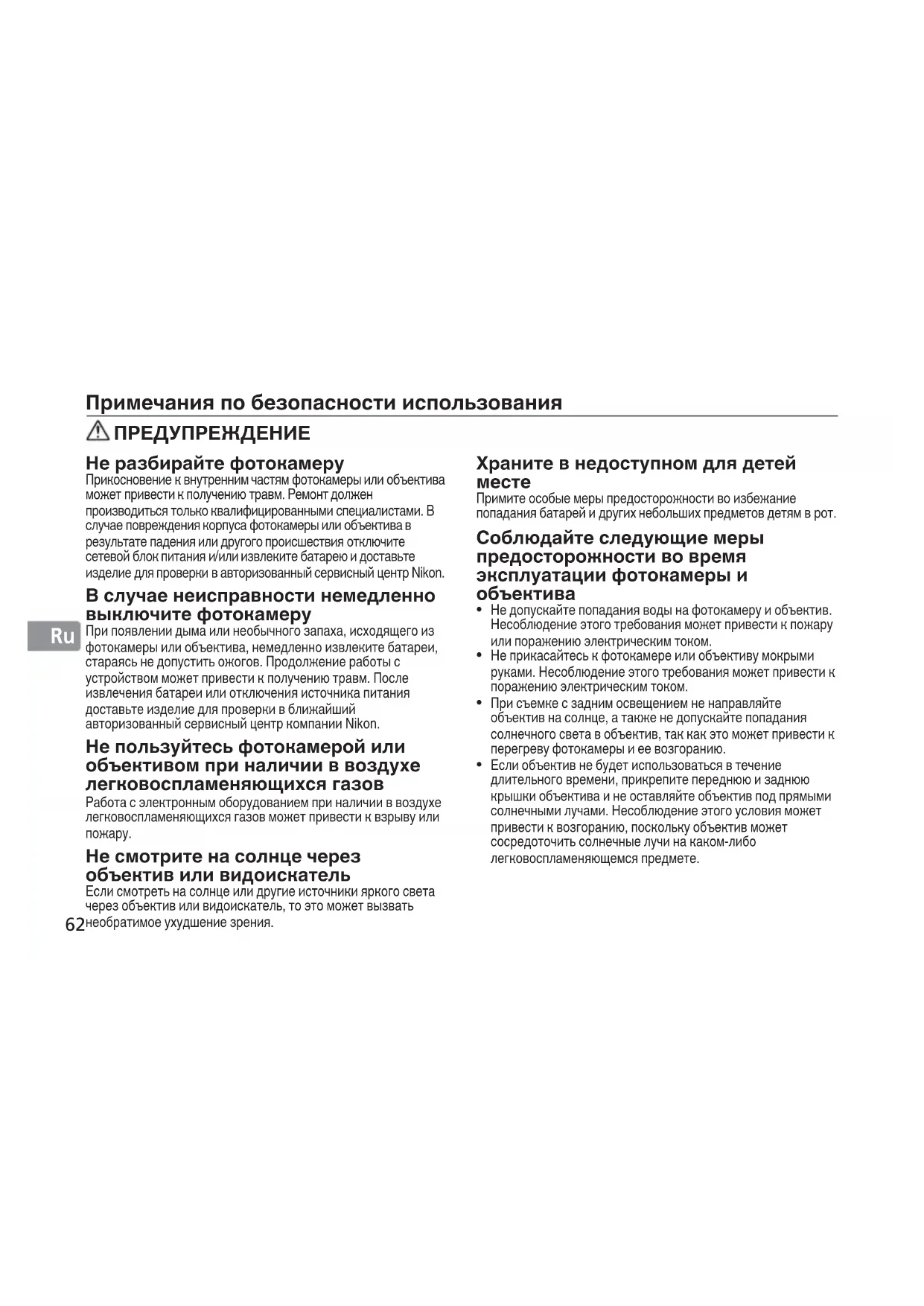 Примечания по безопасности использования ПРЕДУПРЕЖДЕНИЕ Не разбирайте фотокамеру Прикосновение к внутренним частям фотокамеры или объектива может привести к получению травм. Ремонт должен производиться только квалифицированными специалистами. В случае повреждения корпуса фотокамеры или объектива в результате падения или другого происшествия отключите сетевой блок питания и/или извлеките батарею и доставьте изделие для проверки в авторизованный сервисный центр Nikon. В случае неисправности немедленно выключите фотокамеру При появлении дыма или необычного запаха, исходящего из фотокамеры или объектива, немедленно извлеките батареи, стараясь не допустить ожогов. Продолжение работы с устройством может привести к получению травм. После извлечения батареи или отключения источника питания доставьте изделие для проверки в ближайший авторизованный сервисный центр компании Nikon. Не пользуйтесь фотокамерой или объективом при наличии в воздухе легковоспламеняющихся газов Работа с электронным оборудованием при наличии в воздухе легковоспламеняющихся газов может привести к взрыву или