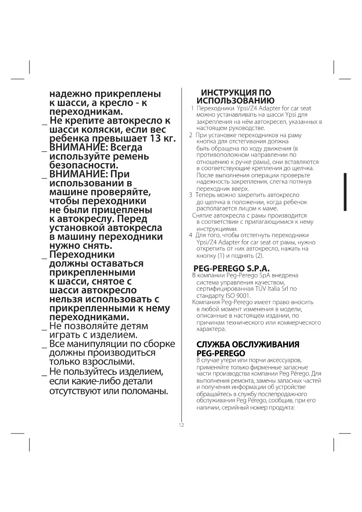 СЛУЖБА ОБСЛУЖИВАНИЯ PEG-PEREGO В случае утери или порчи аксессуаров, применяйте только фирменные запасные части производства компании Peg Pérego. Для выполнения ремонта, замены запасных частей и получения информации об устройстве обращайтесь в службу послепродажного обслуживания Peg Pérego, сообщив, при его наличии, серийный номер продукта: Срок службы: 3 года Гарантийный срок: 12 месяцев тел.: 0039/039/60.88.213 факс 0039/039/33.09.992 e-mail assistenza@pegperego.com сайт в интернете: www.pegperego.com Изготовитель: PEG PEREGO S.P.A. (Пег Перего С.П.А.); Адрес: Via de Gasperi 50 - 20862 ARCORE (MB), Italy (Виа де Гаспери 50, 20862 Аркоре (МБ), Италия). Страна производства: Италия Соответствует требованиям технического регламента ТР ТС 007/201113 ИНСТРУКЦИЯ ПО ИСПОЛЬЗОВАНИЮ 1 Переходники Ypsi/Z4 Adapter for car seat можно устанавливать на шасси Ypsi для закрепления на нём автокресел, указанных в настоящем руководстве. 2 При установке переходников на раму кнопка для отстегивания должна быть обращена по ходу движения (в противоположном направлении по отношению к ручке рамы), они вставляются в соответствующие крепления до щелчка. После выполнения операции проверьте надежность закрепления, слегка потянув переходник вверх. 3 Теперь можно закрепить автокресло до щелчка в положении, когда ребенок располагается лицом к маме. Снятие автокресла с рамы производится в соответствии с прилагающимися к нему инструкциями. 4 Для того, чтобы отстегнуть переходники Ypsi/Z4 Adapter for car seat от рамы, нужно открепить от них автокресло, нажать на кнопку (1) и поднять (2). PEG-PEREGO S.P.A. В компании Peg-Perego SpA внедрена система управления качеством, сертифицированная TÜV Italia Srl по стандарту ISO 9001. Компания Peg-Perego имеет право вносить в любой момент изменения в модели, описанные в настоящем издании, по причинам технического или коммерческого
