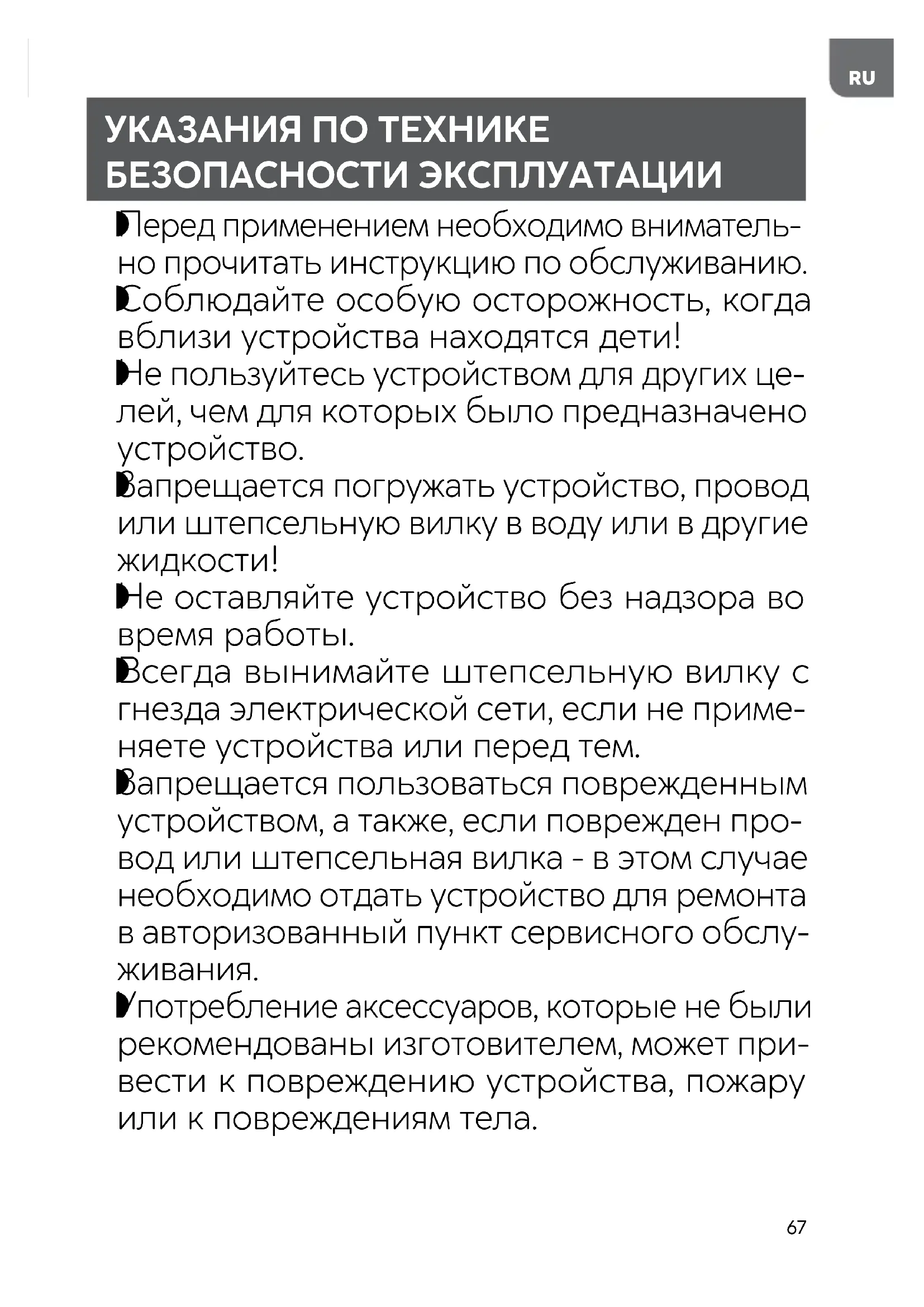 Запрещается пользоваться поврежденным устройством, а также, если поврежден про- вод или штепсельная вилка - в этом случае необходимо отдать устройство для ремонта в авторизованный пункт сервисного обслу-