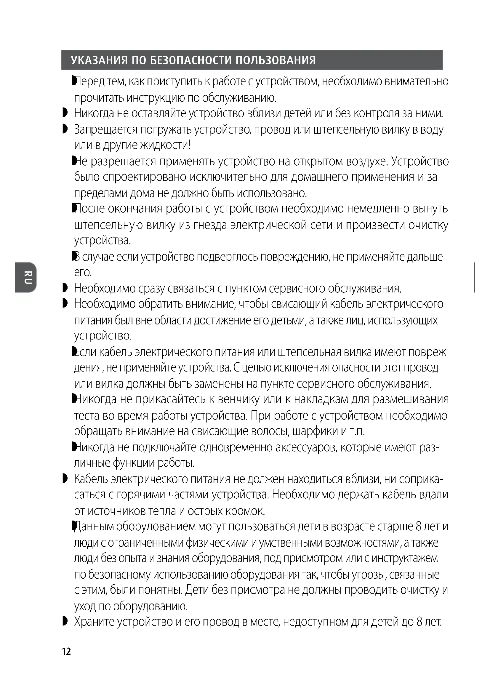 бождает мешалки ❷. ВНИМАНИЕ! Во время перемешивания (миксирования) с крюковыми мешалками для выработки теста, мука может откладываться на кромках миски. Следует ее собирать лопаткой после предварительного выключения миксера. МЕРЫ БЕЗОПАСНОСТИ