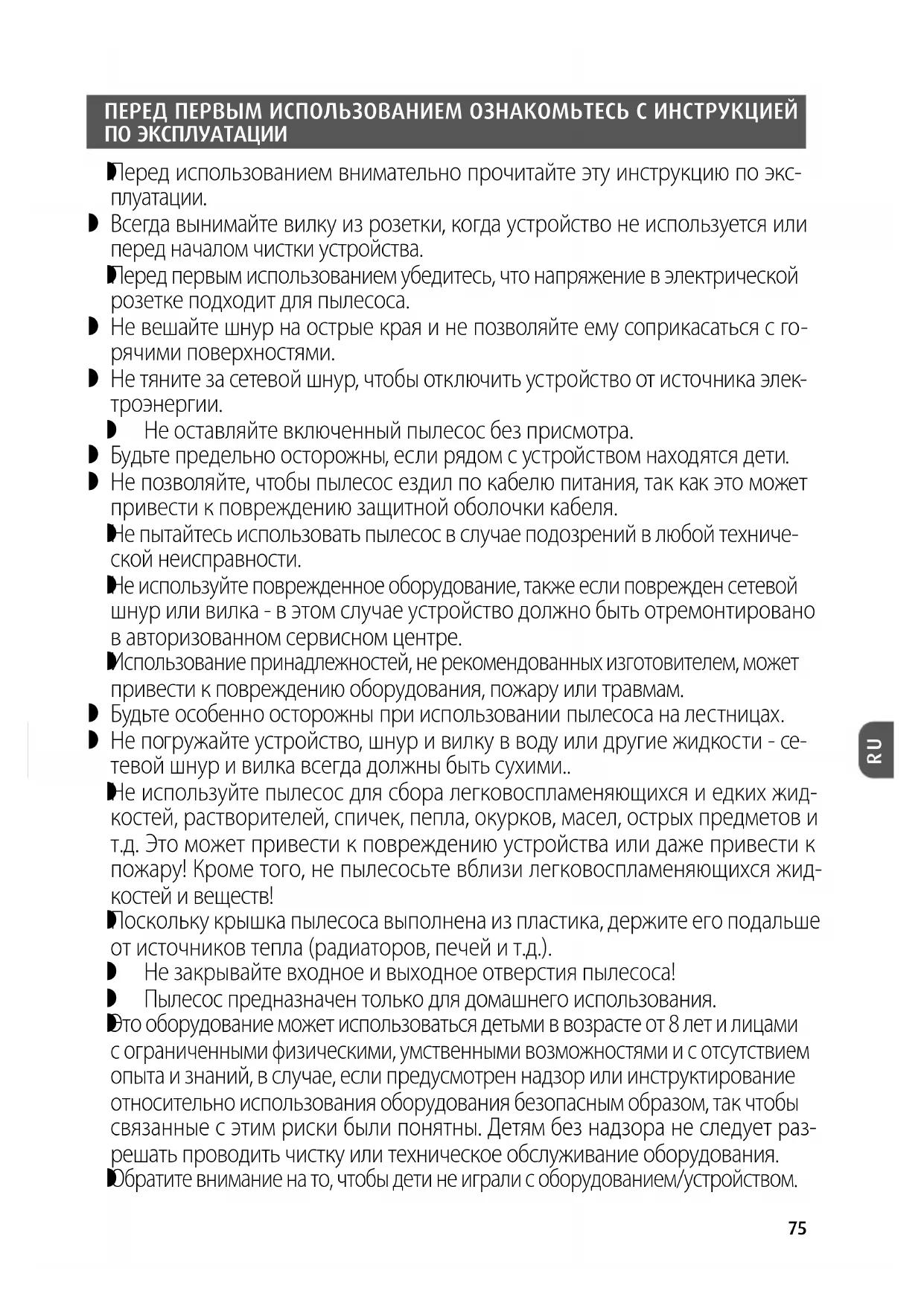 Перед первым использованием убедитесь, что напряжение в электрической розетке подходит для пылесоса. Не вешайте шнур на острые края и не позволяйте ему соприкасаться с го- рячими поверхностями. Не тяните за сетевой шнур, чтобы отключить устройство от источника элек- троэнергии. Не оставляйте включенный пылесос без присмотра. Будьте предельно осторожны, если рядом с устройством находятся дети. Не позволяйте, чтобы пылесос ездил по кабелю питания, так как это может привести к повреждению защитной оболочки кабеля.