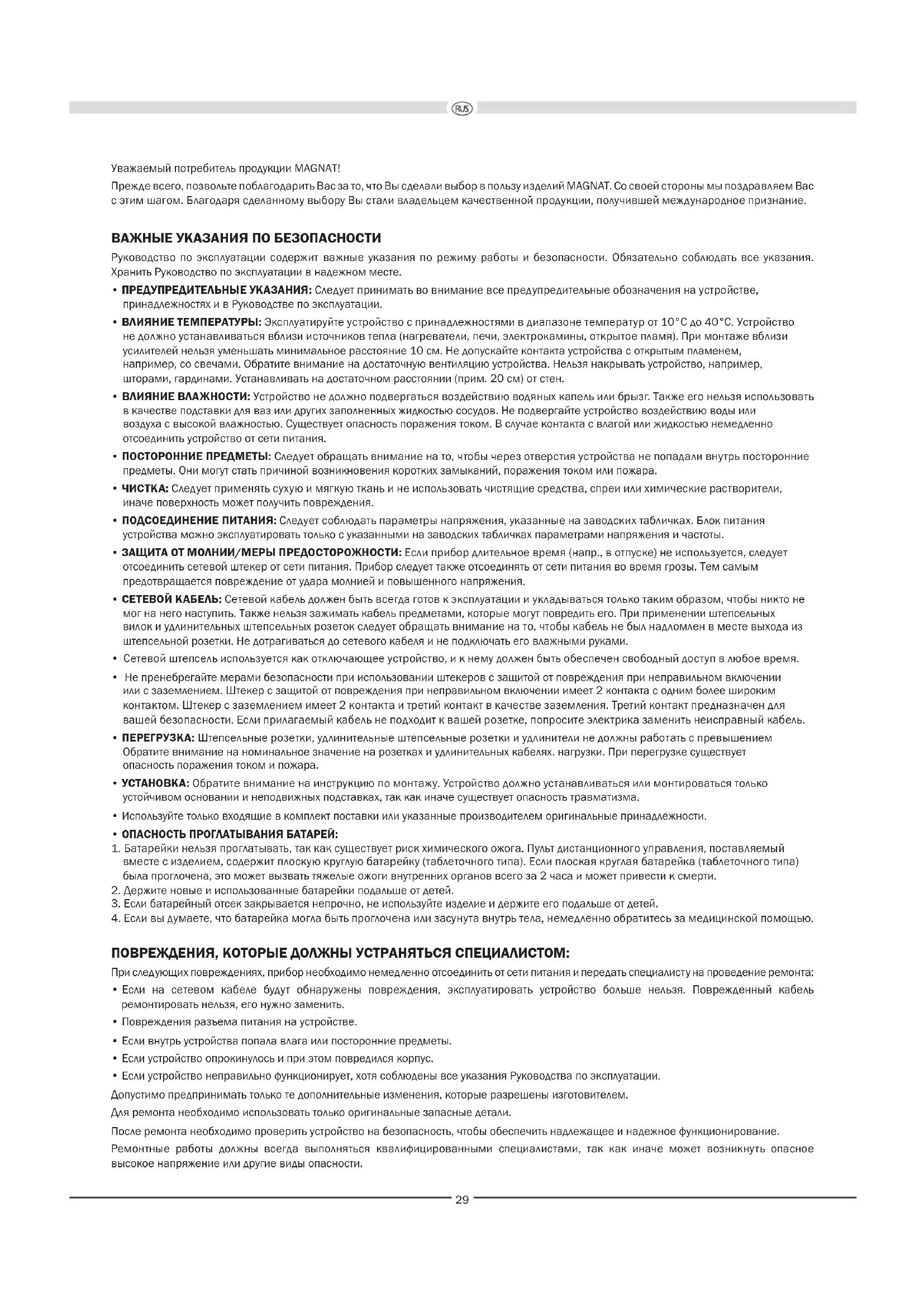- Altavoz pasivo: 3,8 kg RESERVADOS LOS DERECHOS DE REALIZAR CAMBIOS TÉCNICOS29 Уважаемый потребитель продукции MAGNAT! Прежде всего, позвольте поблагодарить Вас за то, что Вы сделали выбор в пользу изделий MAGNAT. Со своей стороны мы поздравляем Вас с этим шагом. Благодаря сделанному выбору Вы стали владельцем качественной продукции, получившей международное признание. ВАЖНЫЕУКАЗАНИЯПОБЕЗОПАСНОСТИ Руководство по эксплуатации содержит важные указания по режиму работы и безопасности. Обязательно соблюдать все указания. Хранить Руководство по эксплуатации в надежном месте.